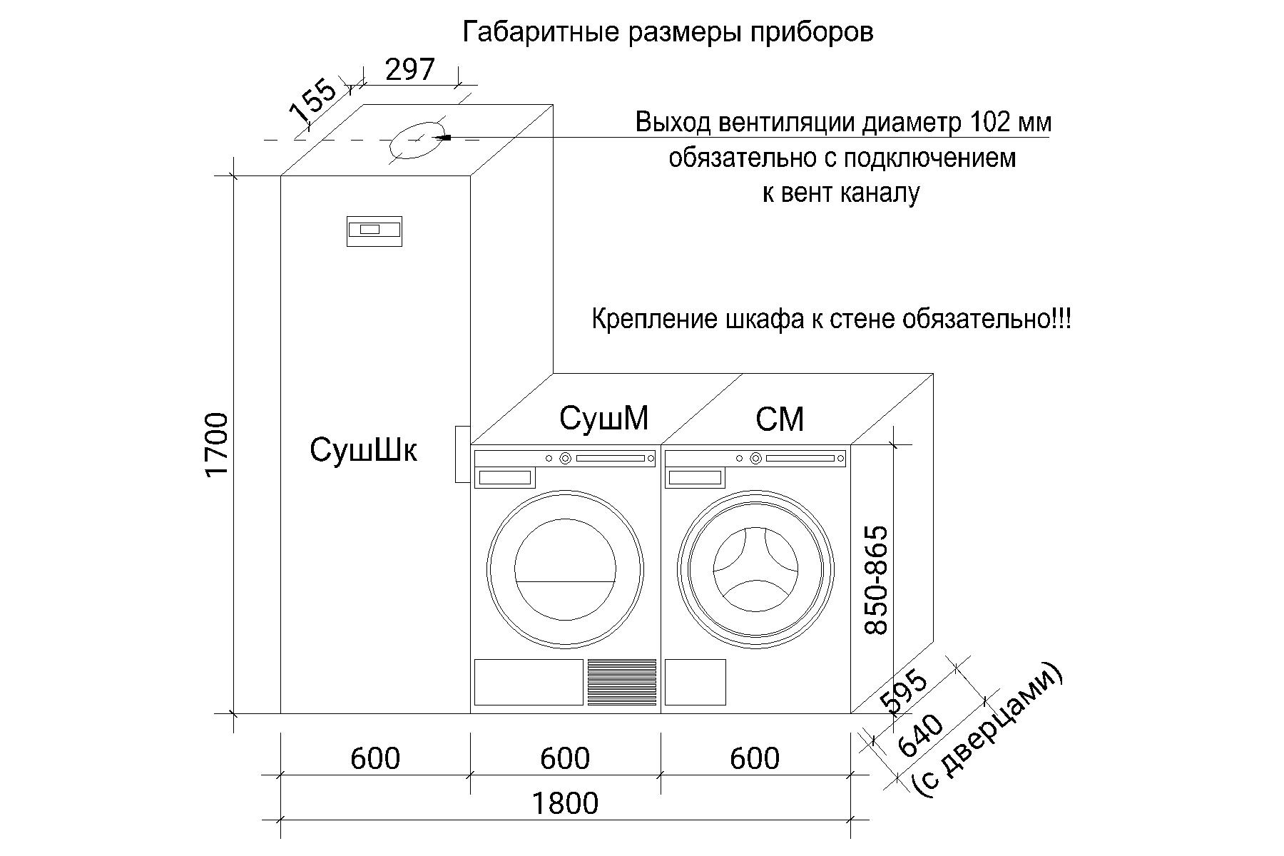 Комбинация из 3х приборов позволит вам не только стирать большие объемы белья (до 8-9 кг), но и сушить хлопоковые и махровые ткани в сушильной машине, деликатные ткани и верхнюю одежду, обувь в сушильном шкафу. Достаточно менее 1 кв.метра для размещения такой прачечной у вас дома.