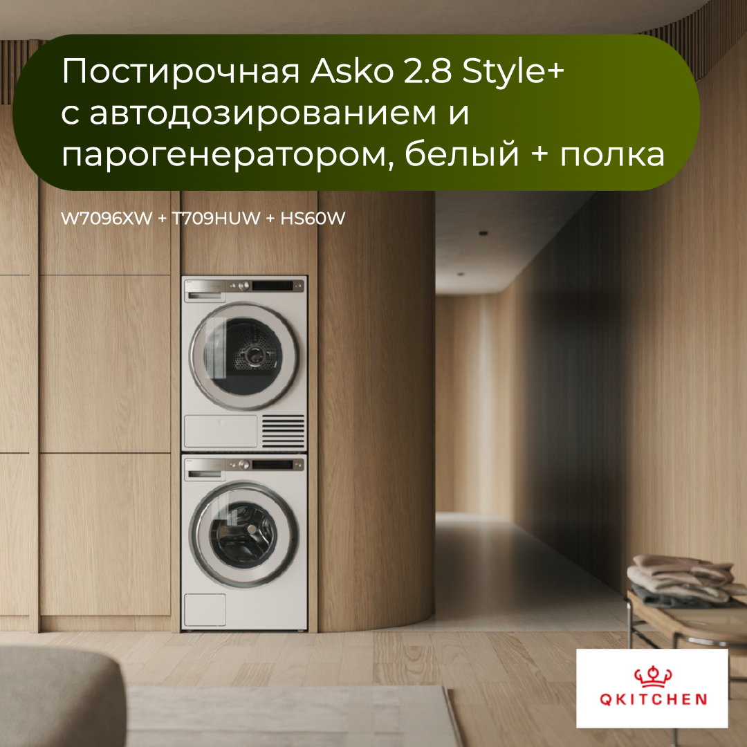 Постирочная Asko для домашнего использования из двух приборов + аксессуар - стиральной машины Asko W7096XW и сушильной машины Asko T709HUW + монтажная полка Asko HS60W