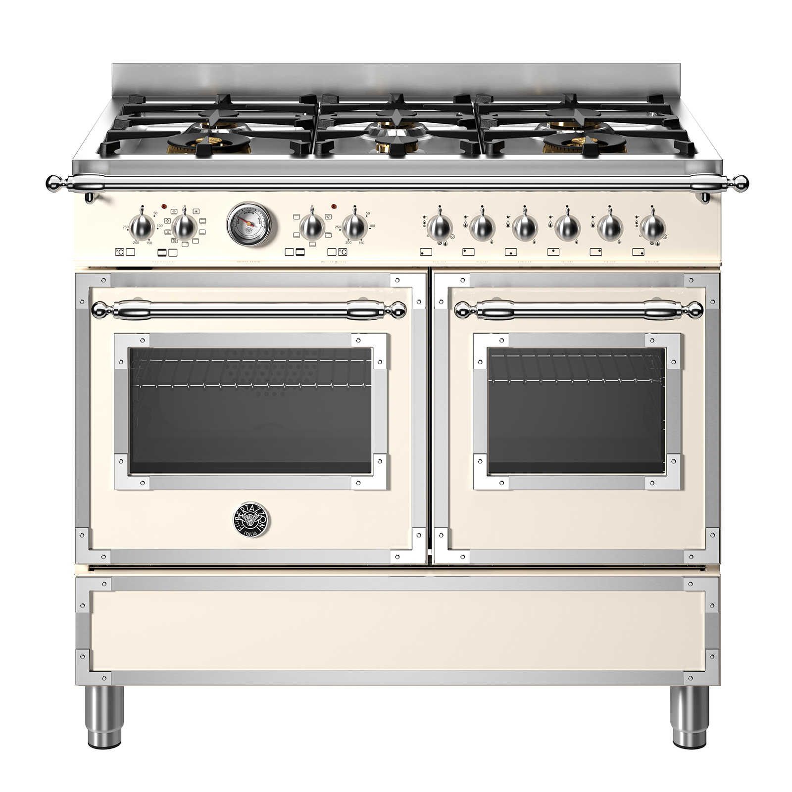 Газовый варочный центр Bertazzoni HER106L2EAVT из линейки Heritage с 2мя электрическими духовками, кремового цвета с фурнитурой цвета состаренное серебро.