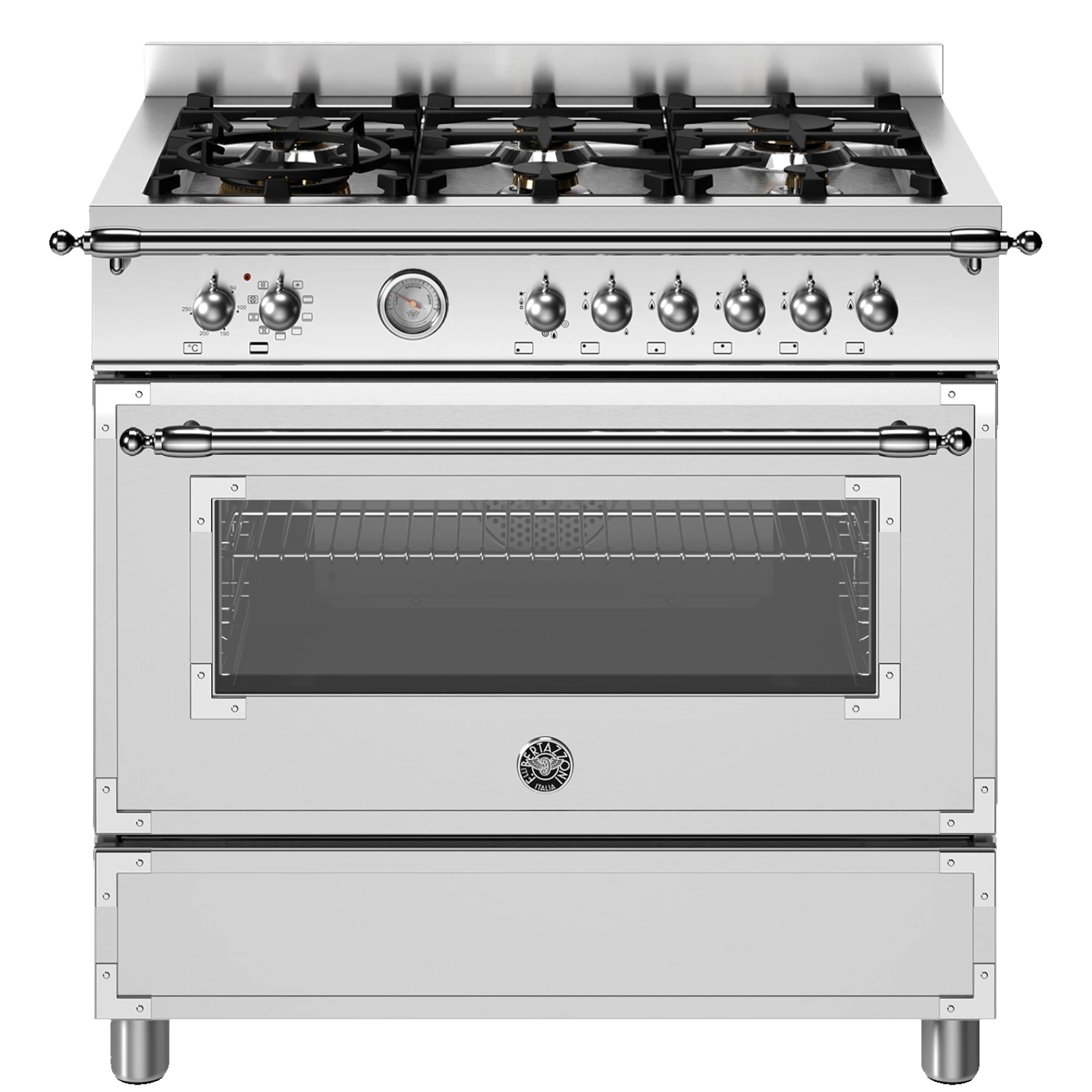 Газовый варочный центр Bertazzoni HER96L1EXT из линейки Heritage с электрической духовкой, в отделке нержавеющая сталь.