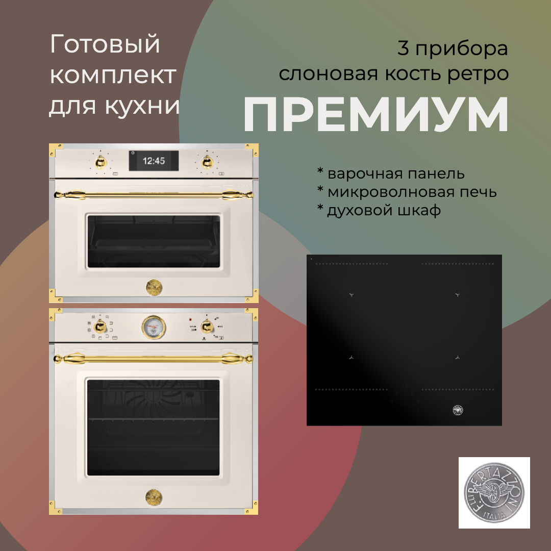 Готовый комплект техники Bertazzoni для кухни из 3 приборов, вариант "премиум" в ретро отделке "слоновая кость +сталь+золото"
