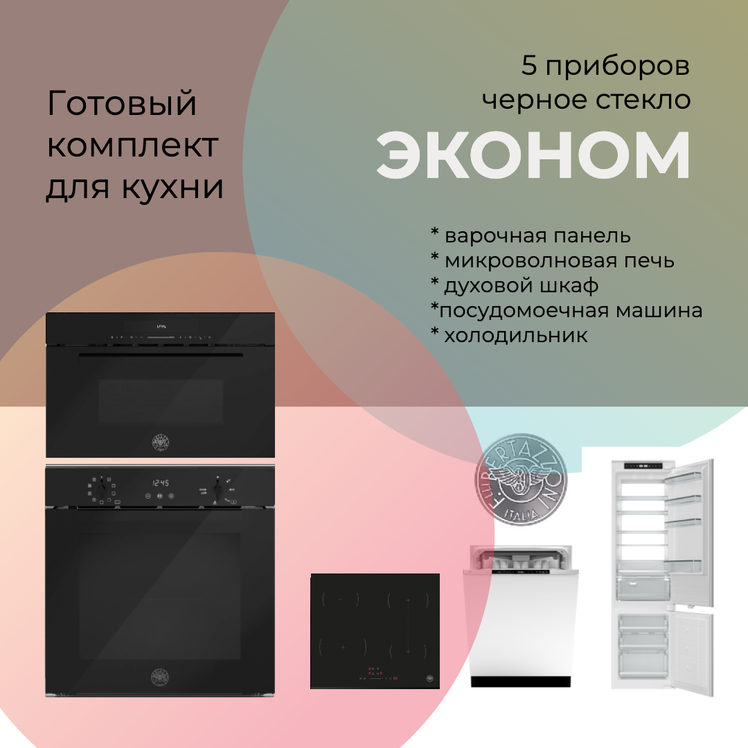 Готовый комплект техники Bertazzoni для кухни из 5 приборов, вариант "эконом" в отделке из черного стекла