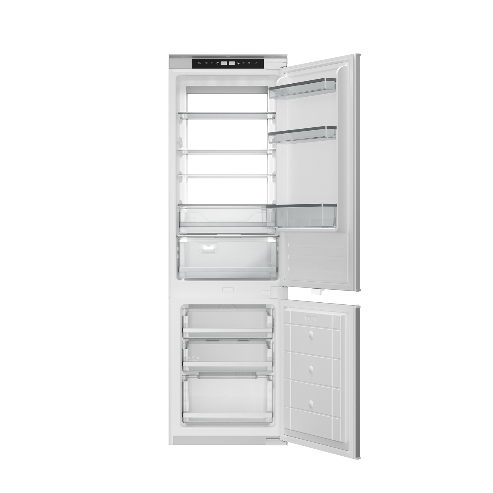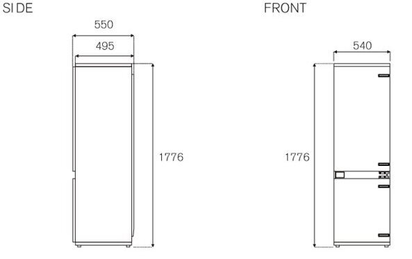 Встраиваемый комбинированный холодильник * система крепления door-to-door (жесткое крепление) * высота 178 см * система Total NoFrost * общий объем 237 л * объем холодильной камеры 170 л * объем морозильной камеры 67 л * LED подсветка * LED дисплей * 4 стеклянных полки * ящик для овощей * 3 морозильных ящика * звуковая сигнализация открытой двери/снижения температуры/отключения электроэнергии * защитная блокировка параметров * размер прибора (В*Ш*Г): 177,5*54*54,5 см