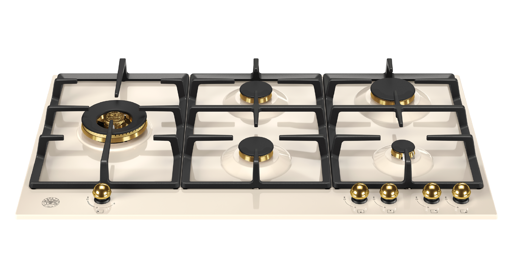 Газовая варочная панель Bertazzoni P905LHERAG шириной 90 см, в отделке - эмаль цвета слоновой кости с золотой фурнитурой