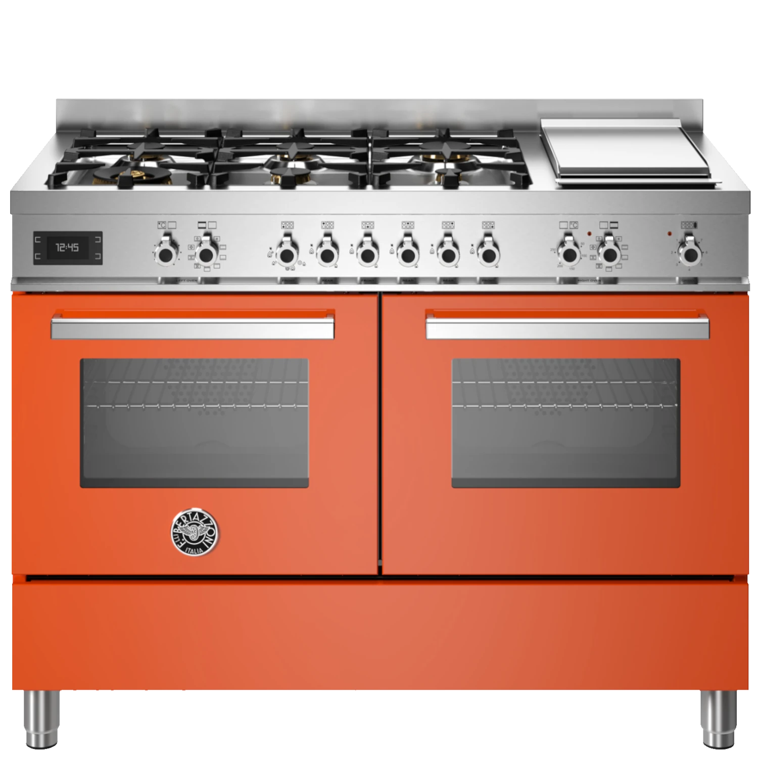 Газовый варочный центр Bertazzoni PRO126G2EART из линейки Professional с 2мя электрическими духовками, в оранжевом цвете.