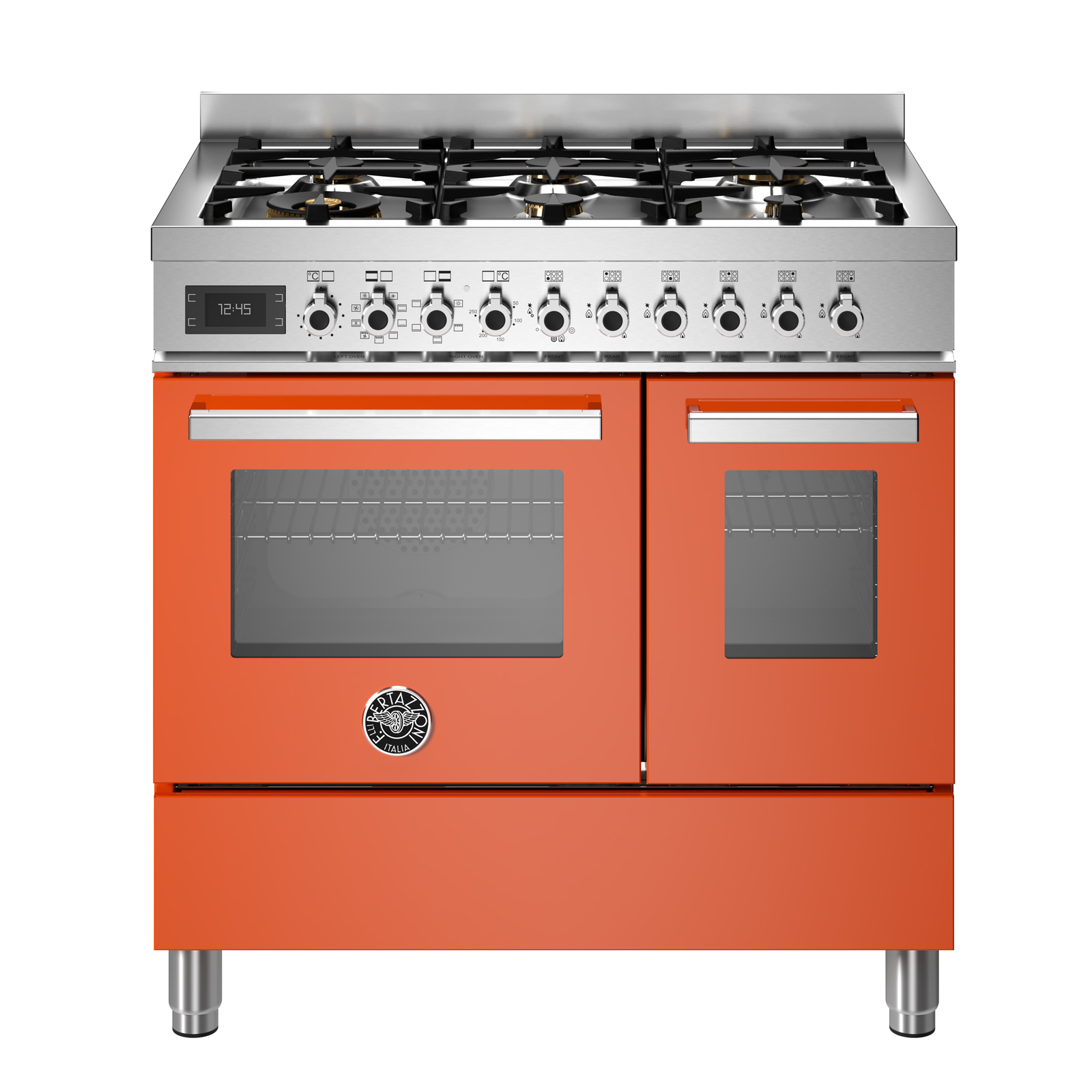 Газовый варочный центр Bertazzoni PRO96L2EART из линейки Professional с 2мя электрическими духовками, в цвете оранжевый глянец с отделкой из нерж.стали
