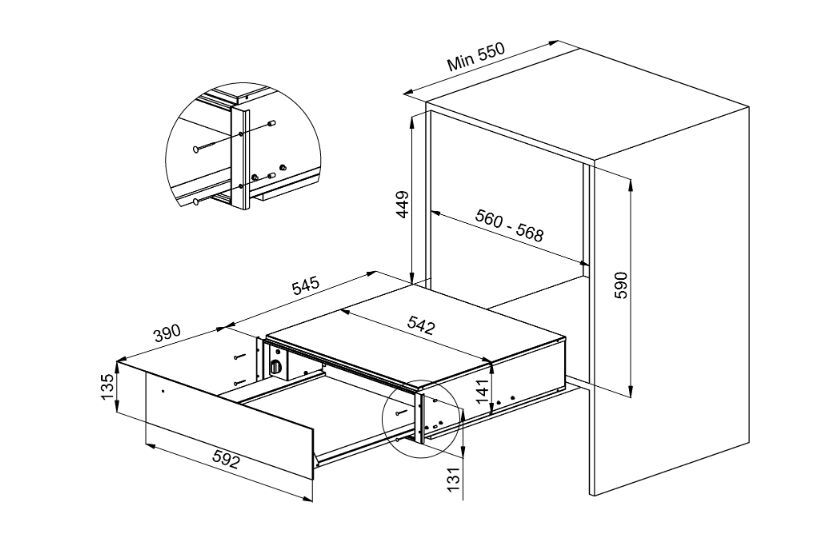 Внешний фронт ящика - холодный. Нагревательный элемент располагается в нижней части ящика и закрыт керамическим стеклом (легким в уходе). Внешняя световая индикация.