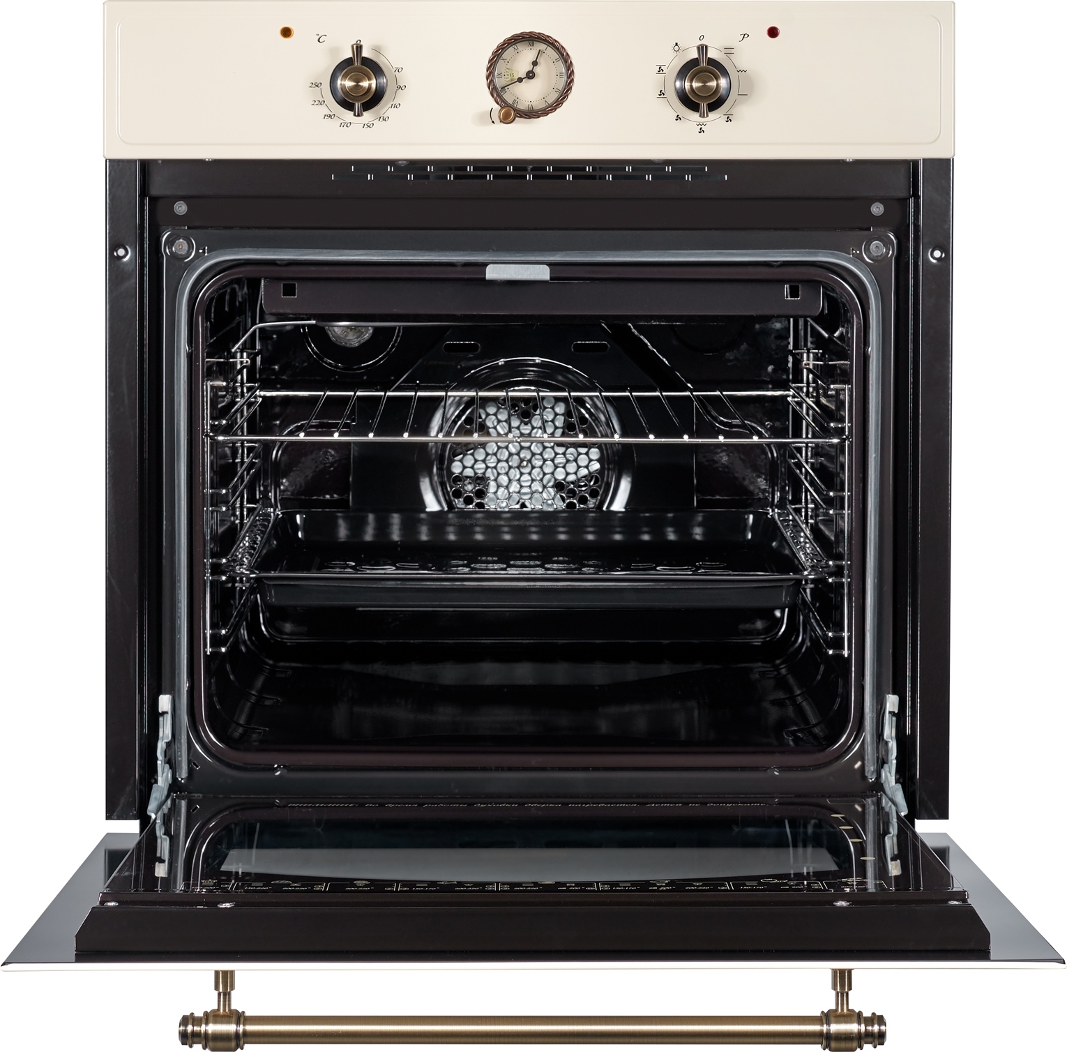 Встраиваемый духовой шкаф Weissgauff EOA 69 OW из коллекции RUSTIC в цвете "слоновая кость", оснащённый телескопическими направляющими - это целых 9 режимов приготовления и особый дизайн "люкс", в котором каждый элемент, начиная от рукояток и заканчивая цветом корпуса, выражает собой престиж и наивысший уровень исполнения.
