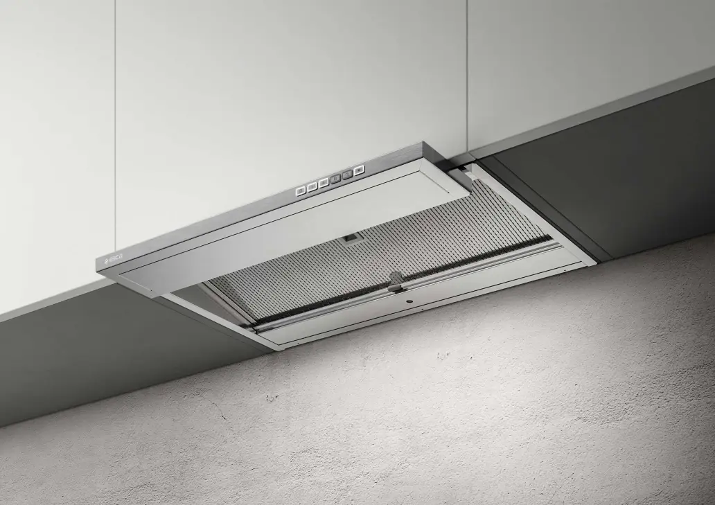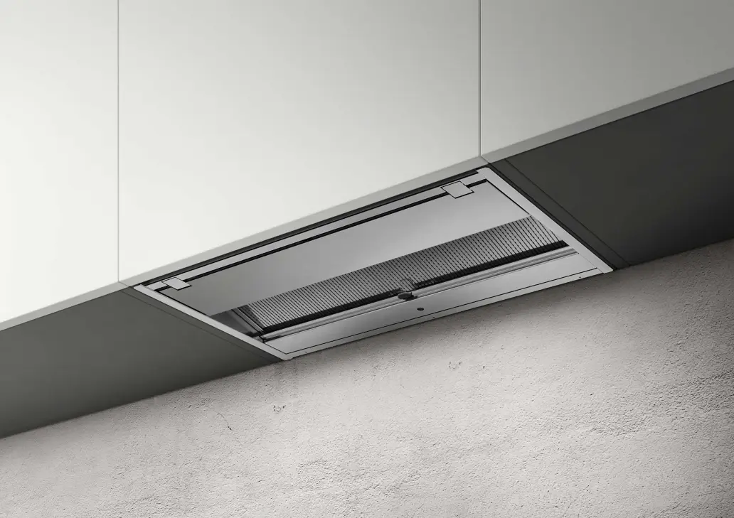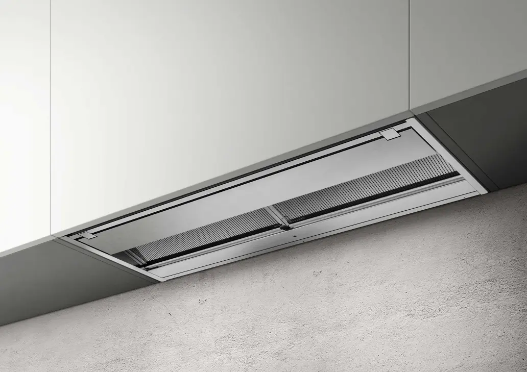 Система резисторов работает в сочетании с наклонной механической решетчатой конструкцией, по которой капли стекают в извлекаемую ванночку, и защитной передней панелькой, отводящей пары от дверок навесной мебели, благодаря наклону в 45°.