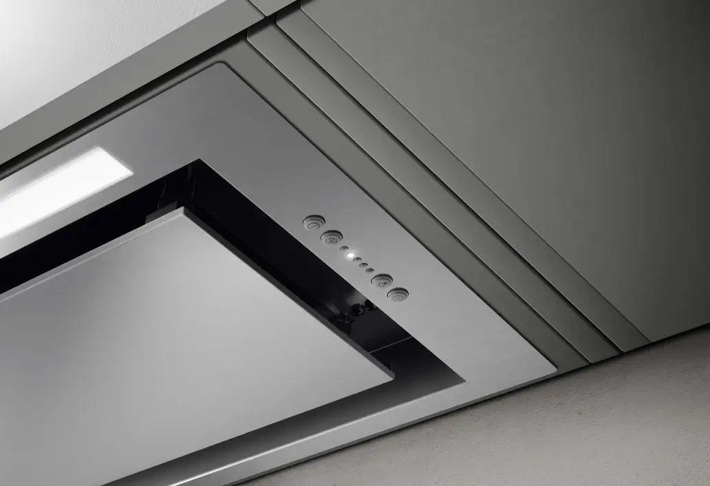 Основные характеристики включают полностью скрытый фильтр, который продлевает его срок службы, и освещение с помощью светодиодов, обеспечивающее яркий свет на передней панели. Вытяжка работает в режиме отвода и рециркуляции (с угольным фильтром, покупаемым отдельно) и предлагает три скорости, включая интенсивный режим для быстрого удаления запахов.