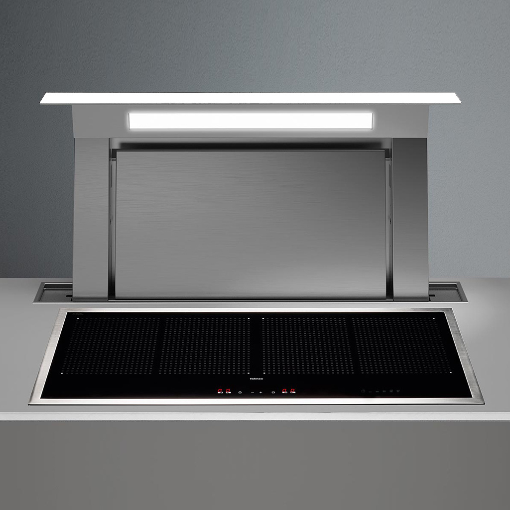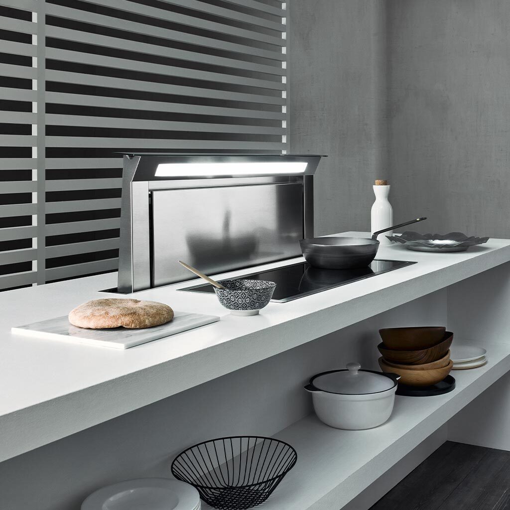 При таком способе установки вытяжка встроенная в столешницу, но благодаря специальной системе, автоматически выдвигается во включенном состоянии. Устройство аспирирует дым и пар непосредственно рядом с источником его возникновения, одновременно с этим освещая рабочую поверхность. Такая система обеспечивает большую гибкость и универсальность установки, включая различные варианты подключения и выбор наиболее подходящего двигателя, который м.б.установлен в вытяжку.