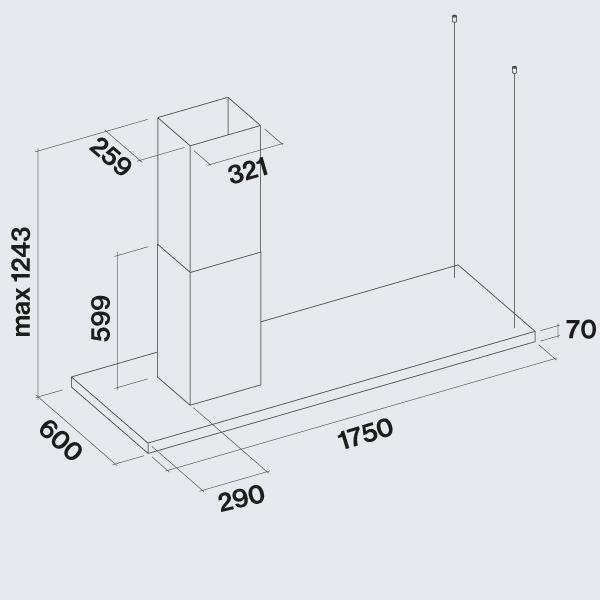 Островная вытяжка, левая версия (управление с левой стороны) шириной 175 см Falmec ELLE с потолочным креплением, производительностью 1280 м3/час