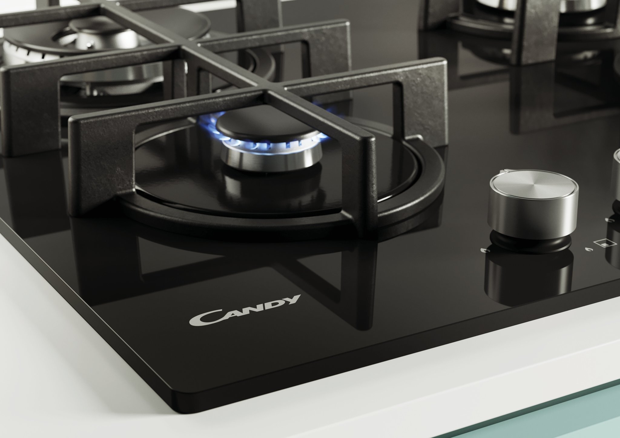 Встраиваемая газовая варочная панель на стекле Candy CVG6BR4WPB шириной 60 см, в отделке из черного стекла