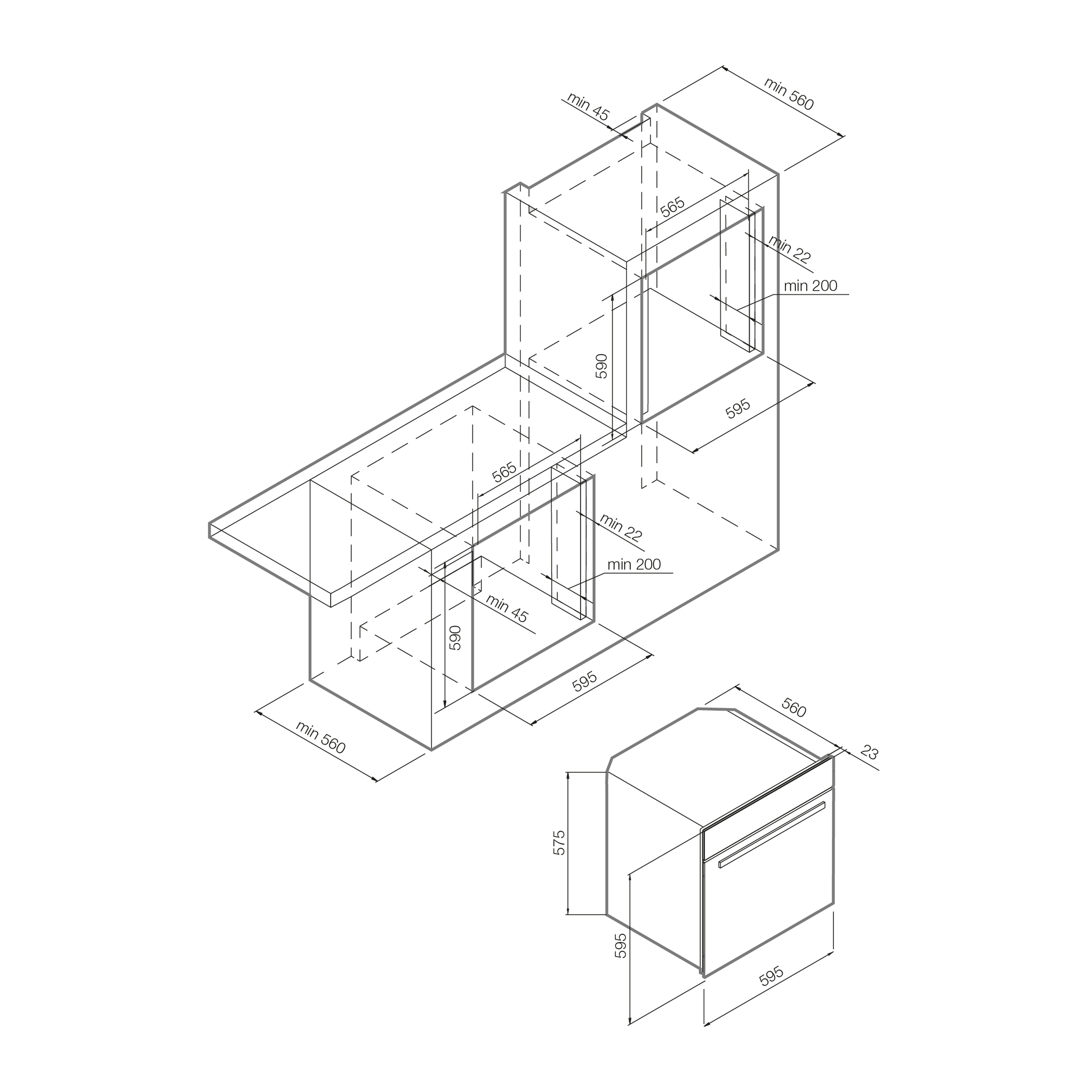 Прибор размещается в нише, размеры которой указаны в схеме установки. Материалы кухонной мебели должны быть термостойкими (>75⁰С). Для лучшей циркуляции воздуха используйте кухонный шкаф, дно которого короче боковых стенок, по возможности устраните заднюю стенку кухонного шкафа. Расстояние между верхней частью прибора и нижней частью рабочей поверхности должно быть не менее 10 мм и не закрыто планками или уплотнителями. После установки убедитесь, что прибор надежно закреплен.