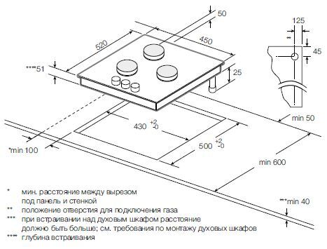 Для установки варочной поверхности необходима рабочая поверхность толщиной не менее 30 мм, в которой производится вырез по размерам согласно схеме встраивания. Поверхность встраивания должна выдерживать 100 °C. По периметру выреза необходимо установить специальный уплотнитель, который идет в комплекте. У каждой конфорки есть электроподжиг и газ-контроль. Следует ухаживать за варочной поверхностью от загрязнений и при необходимости очищать жесткой щеткой датчик газ-контроля от образования нагара. Необходимо использовать посуду, подходящую по размерам к каждой конфорке. Края посуды не должны выходить более чем на 2 см за зону приготовления.