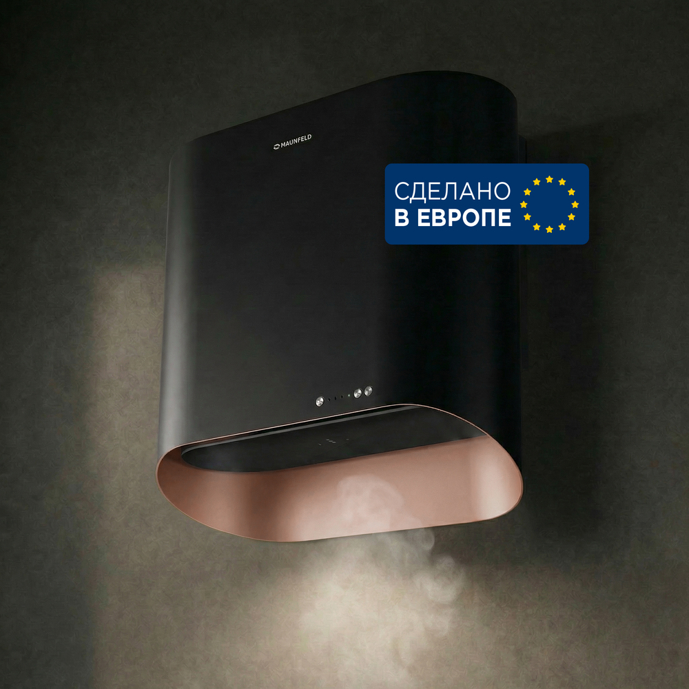 Настенная вытяжка Maunfeld GUNA 60 в роскошном исполнении «черный антрацит с розовым золотом» станет истинным украшением кухни, превращая процесс приготовления пищи в эстетическое удовольствие. Благодаря впечатляющей мощности, она мгновенно устраняет пар и запахи даже в просторных помещениях до 40 кв.м., сохраняя воздух безупречно свежим. Уникальное бесконтактное управление позволяет переключать четыре скорости простым взмахом руки — это идеальное решение для хозяйки, чьи руки могут быть заняты или испачканы в муке, так как панель всегда будет оставаться идеально чистой, без единого отпечатка.