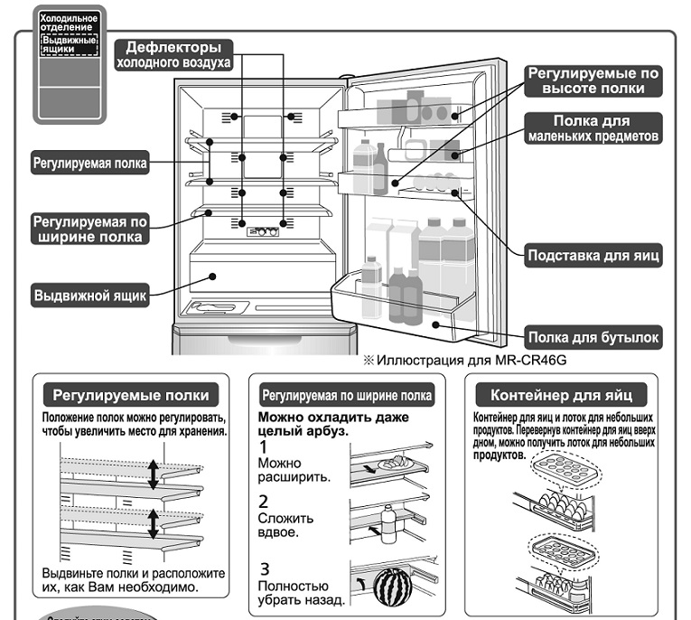 Удобная панель управления позволяет легко регулировать работу холодильника. MR-CR46G имеет несколько основных режимов работы, включая режим ECO и режим энергосбережения. Режим ECO позволяет достигнуть действительно высокого уровня энергосбережения, который отражается специальным индикатором на панели управления.