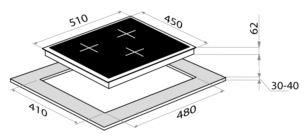 Для установки варочной поверхности необходима рабочая поверхность толщиной не менее 30 мм, в которой производится вырез по размерам согласно схеме встраивания. По периметру выреза необходимо установить самоклеящуюся термоизоляционную ленту, которая идет в комплекте (в некоторых моделях она уже наклеена по периметру варочной поверхности). Под варочной поверхностью можно устанавливать духовки, оснащённые охлаждающим вентилятором, при этом необходимо обеспечить пространство между варочной поверхностью и духовым шкафом минимум 5 мм.