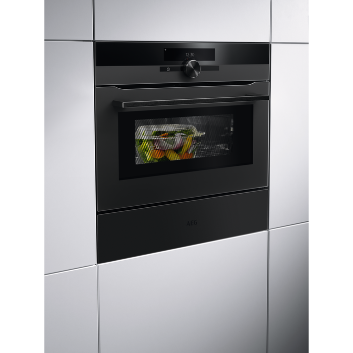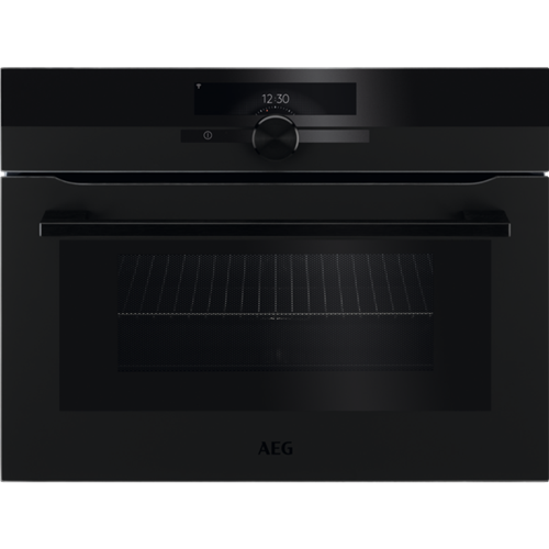 Компактный духовой шкаф с микроволновой печью AEG KMK965090T выполнен в стильной черной отделке, состоящей из стекла и стали. У него габариты 60 на 45 см и объем 43 литра, предлагающий 16 режимов нагрева и 7 режимов микроволн, а мощность последней составляет 1000 Вт. Устройство оборудовано TFT-дисплеем, позволяющим легко управлять температурой и выбирать программы, а также встроенными функциями гриля, таймера, отсрочки старта, светом и сигнализацией окончания готовки.