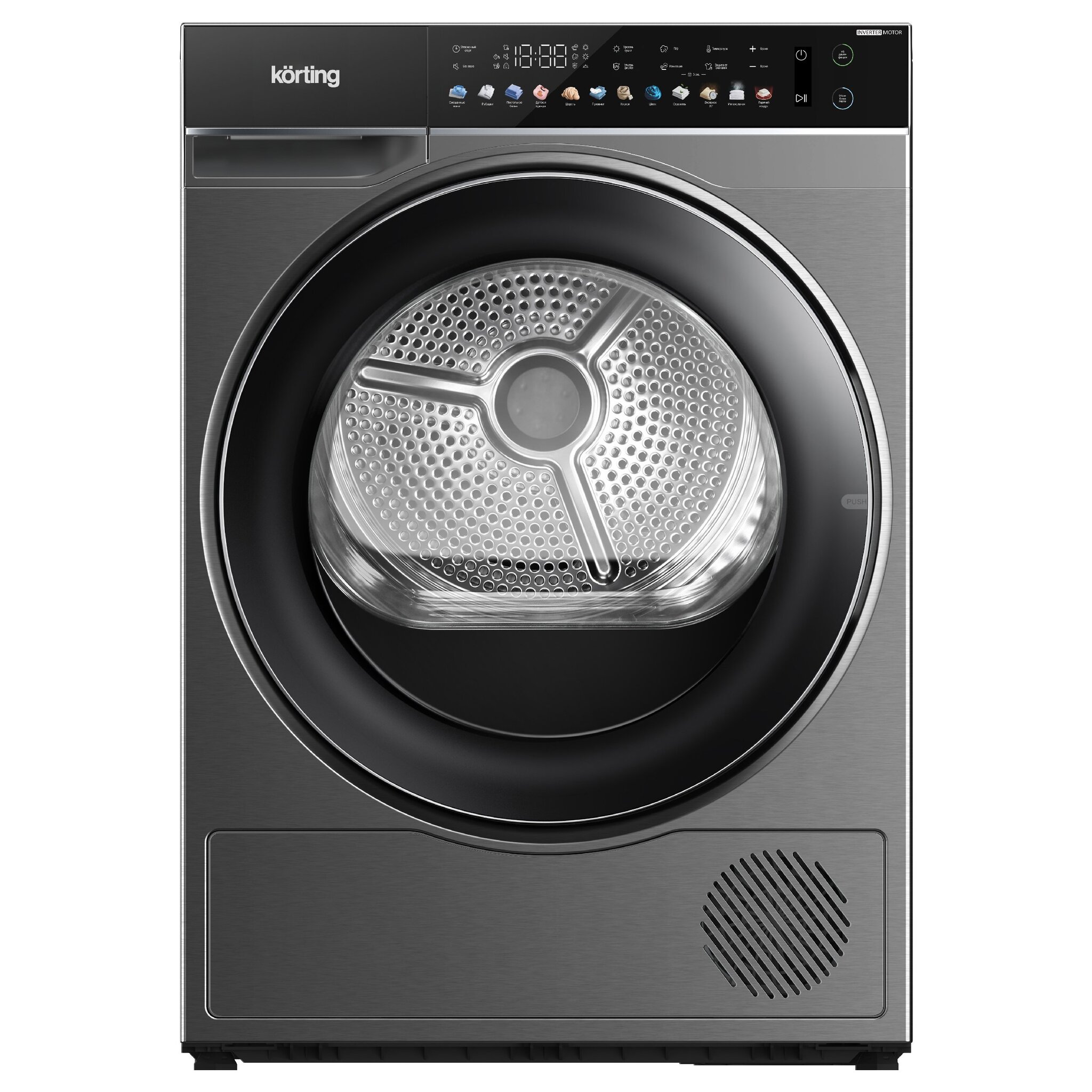Сушильная машина Korting KD 69IHP10 An с тепловым насосом в антрацитом цвете и глубиной 64 см представляет собой мощное устройство с загрузкой на 10 кг и 12 программами с электронным управлением. Уникальная технология Heat Pump, обеспечивающая деликатную сушку при температуре не выше 40°C, значительно снижает потребление электроэнергии в сравнении с обычными моделями. Инверторные мотор и компрессор повышают эффективность сушки на 30%, а ионизатор и функция ультрафиолетовой дезинфекции заботятся о чистоте и свежести одежды.