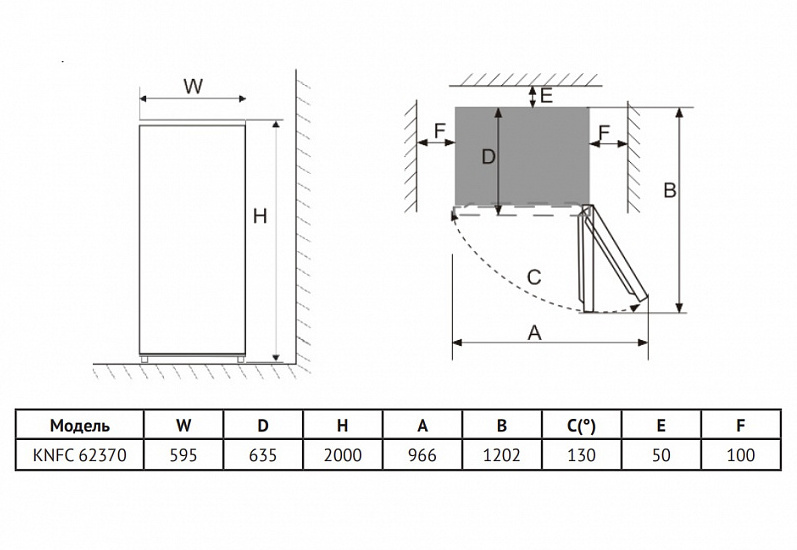 После транспортировки, перед подключением, следует оставить прибор в вертикальном положении в течение 2 часов. Установка прибора следует производить в вентилируемые ниши, с учетом указанных расстояний до ближайших поверхностей. Дверь холодильника может перенавешиваться и открываться в правую или левую сторону. Рекомендуется устанавливать холодильник / морозильник на удалении от нагревающихся приборов, чтобы сократить частоту включения компрессора и продлить срок службы прибора.