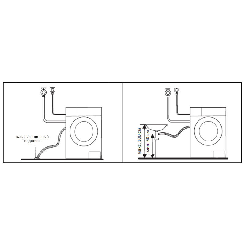Разместите стиральную машину вблизи места ее использования. Открутите 4 болта на задней стенке и извлеките 4 транспортировочные втулки. Отрегулируйте прибор по уровню с помощью инструмента, затем зафиксируйте положение ножек с помощью контргайки. Стиральная машина должна быть заземлена. Прибор оснащен шнуром питания и вилкой. Вилку необходимо вставлять в должным образом установленную и заземленную розетку. Не подвергайте прибор замораживанию. Температура в помещении не должна опускаться ниже 3°C. Стиральная машина должна быть установлена таким образом, чтобы заливные и сливные шланги не были зажаты и не имели перегибов. Гофрированный сливной шланг должен быть подключен к трубе высотой от пола 50-85 см, используйте изогнутый держатель, который идет в комплекте.