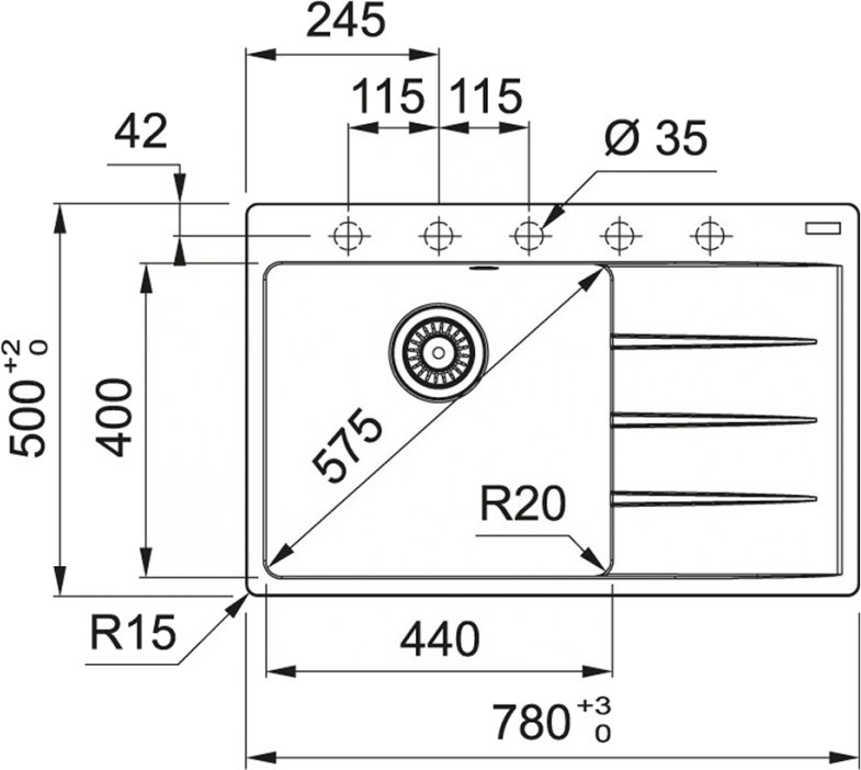 Все мойки Centro имеют усиленные ребра жесткости с обратной стороны для обеспечения ровного края по всей длине мойки. В связи с этим для монтажа смесителя на мойках Centro требуется установка специального фланца, входящего в комплект.
