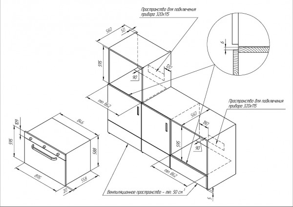 Прибор размещается в нише, размеры которой указаны в схеме установки. Материалы кухонной мебели должны быть термостойкими (>75⁰С). Для лучшей циркуляции воздуха используйте кухонный шкаф, дно которого короче боковых стенок, по возможности устраните заднюю стенку кухонного шкафа. Расстояние между верхней частью прибора и нижней частью рабочей поверхности должно быть не менее 10 мм и не закрыто планками или уплотнителями. После установки убедитесь, что прибор надежно закреплен.