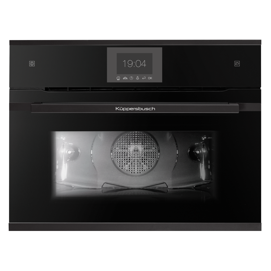 Встраиваемый компактный духовой шкаф Kuppersbusch CBD 6550.0 S5-Airfry с функцией приготовления на пару и противнем с аэрофритюром, в отделке из черного стекла и профиля "черный вельвет"