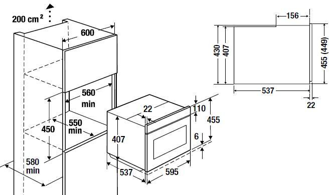 Прибор устанавливается в мебельную нишу с размерами согласно схеме встраивания. Микроволновая печь должна быть заземлена. Прибор оснащен шнуром питания и вилкой. Вилку необходимо вставлять должным образом, установленную и заземленную розетку. Задняя панель корпуса не должна быть закрыта стенкой кухонной мебели. Следите за тем, чтобы вентиляционные отверстия печи не оказались заблокированы. Это может привести к некорректной работе. Используйте только рекомендованную для микроволновых печей посуду. Список рекомендуемой посуды находится в инструкции по эксплуатации.