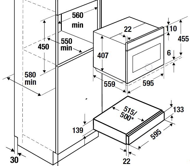 - совместная установка с компактными приборами высотой 45 см в нишу высотой 59 см обеспечивает дополнительное место для хранения столовых приборов