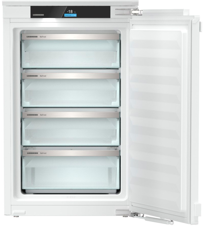 Встраиваемый морозильник для колонны Liebherr IFNci 3954 Prime (линия Pure), высота 88 см. Полезный объем 86 л, 1 температурная зона, диапазон -15…-28 °C, NoFrost и автоматическое размораживание. Управление Touch & Swipe на 2,4" TFT. SuperFrost для бережной заморозки, EnergySaver для экономии. Производительность до 12 кг/сутки, автономия до 15 ч. Сигнал открытой двери и повышения температуры, блокировка экрана, BottleTimer, Party и SabbathMode. Перевешиваемая дверь, угол 115°, петли SoftSystem.
