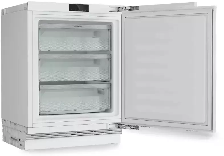 Встраиваемый морозильник под столешницу Liebherr SUFd 3603 Pure с NoFrost: высота 82–88 см, жесткое крепление фасада, объем 85 л, одна температурная зона и контур, диапазон −15…−28 °C, замораживание 7 кг/сутки, автономия 17 ч. Три контейнера на встроенных направляющих, VarioSpace для высокого пространства, лоток для льда, перенавешиваемая дверь 115°. Управление Touch Minimal UI/TouchControl, индикатор температуры.