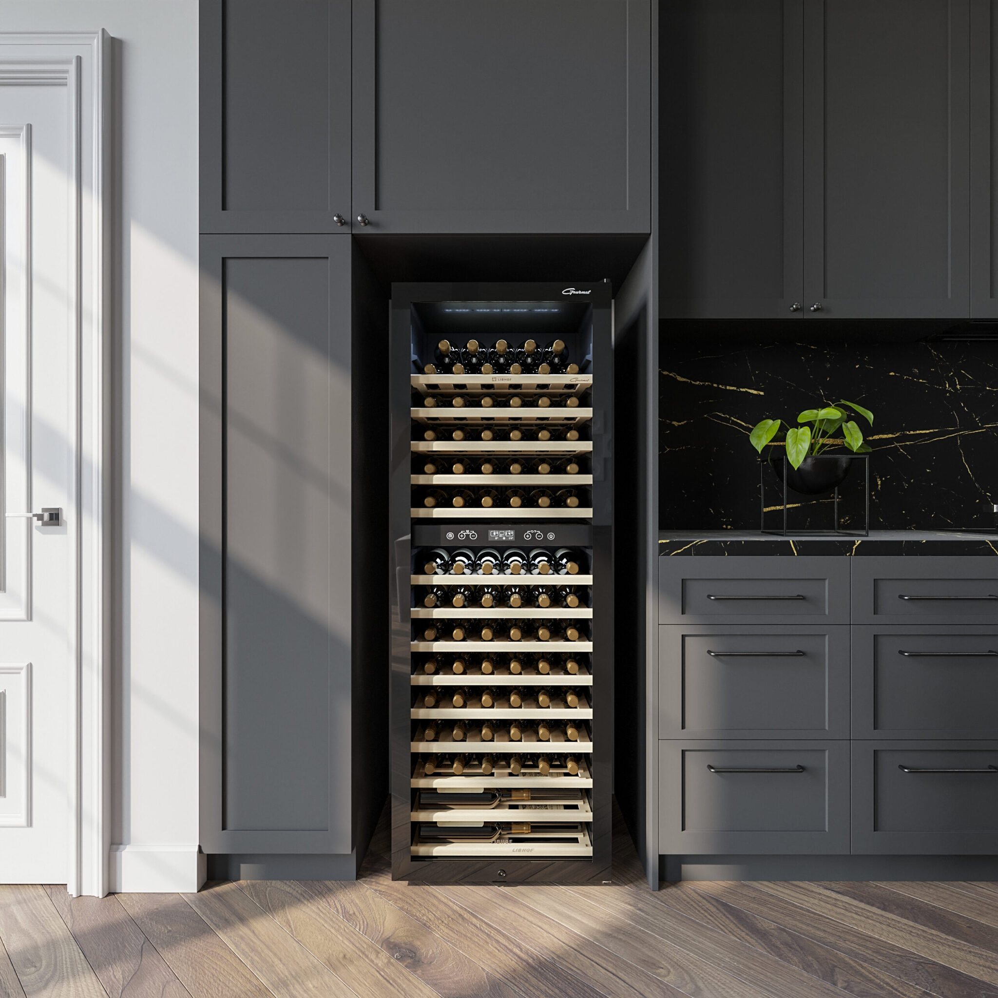 Высокий винный шкаф с 2мя температурными зонами Libhof GMD-83 Black, в отделке из черного стекла