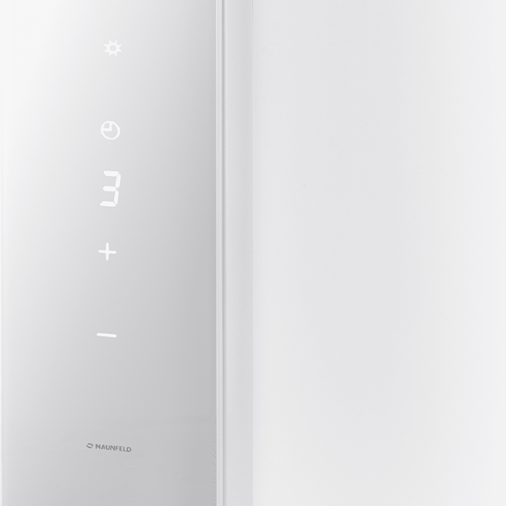 - Сенсорное управление в вытяжках Maunfeld интегрировано в глянцевую панель на фасаде, где размещены дисплей и чувствительные элементы, обеспечивая интуитивный и быстрый доступ ко всем функциям. Оно позволяет легко выбрать одну из четырёх скоростей работы и задать время отключения с помощью встроенного таймера, минимизируя механические детали и повышая надёжность.