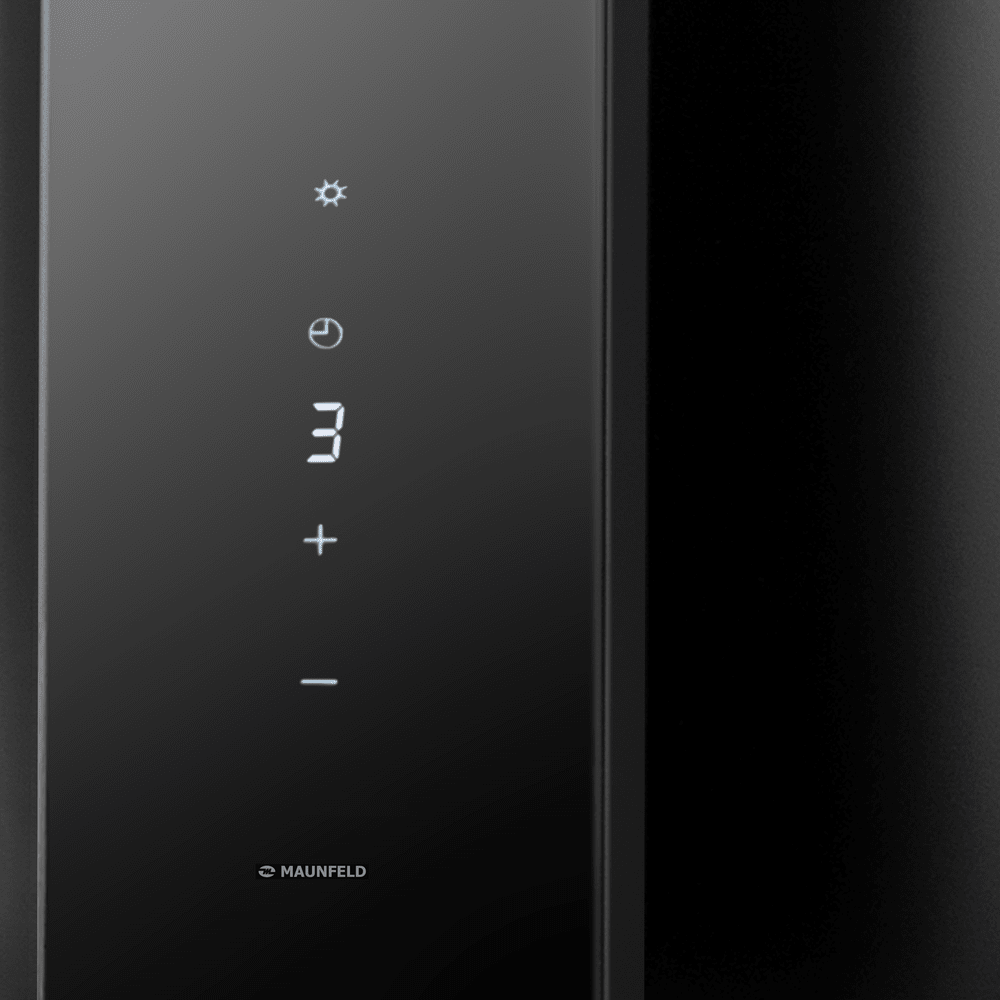 - Сенсорное управление в вытяжках Maunfeld интегрировано в глянцевую панель на фасаде, где размещены дисплей и чувствительные элементы, обеспечивая интуитивный и быстрый доступ ко всем функциям. Оно позволяет легко выбрать одну из четырёх скоростей работы и задать время отключения с помощью встроенного таймера, минимизируя механические детали и повышая надёжность.
