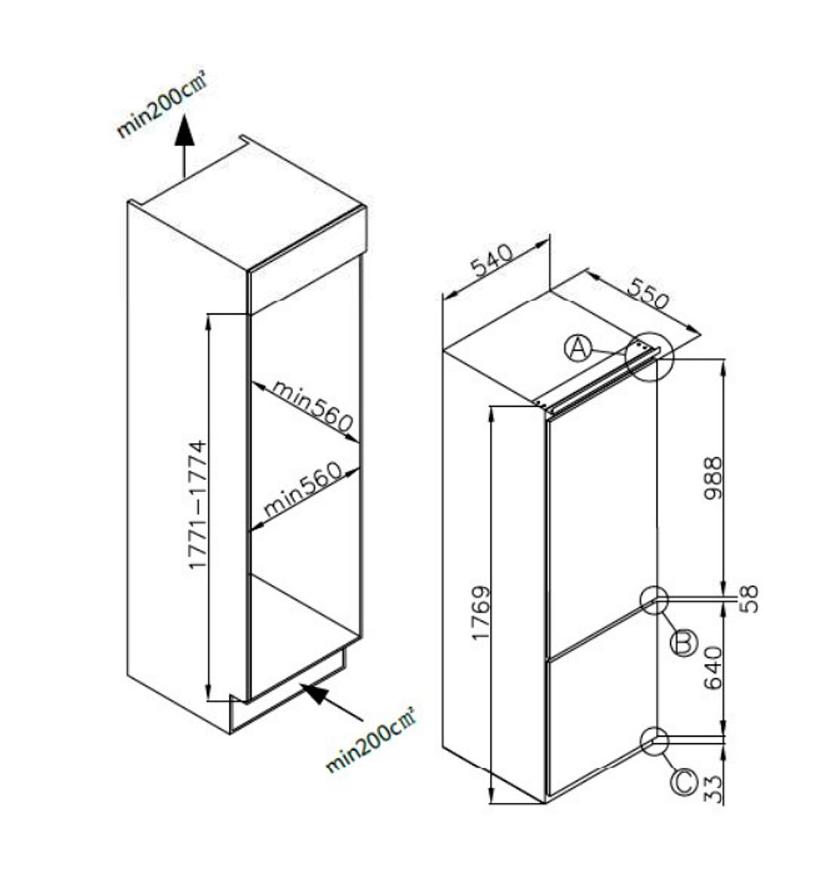 После транспортировки, перед подключением, следует оставить прибор в вертикальном положении в течение 2 часов. Установка прибора следует производить в вентилируемые ниши, с учетом указанных расстояний до ближайших поверхностей. Фасад может навешиваться путем жесткого крепления непосредственно на дверцу прибора или при помощи направляющих. Тип навешивания фасада необходимо уточнить перед приобретением. Дверь холодильника может перенавешиваться и открываться в правую или левую сторону. Рекомендуется устанавливать холодильник / морозильник на удалении от нагревающихся приборов, чтобы сократить частоту включения компрессора и продлить срок службы прибора.