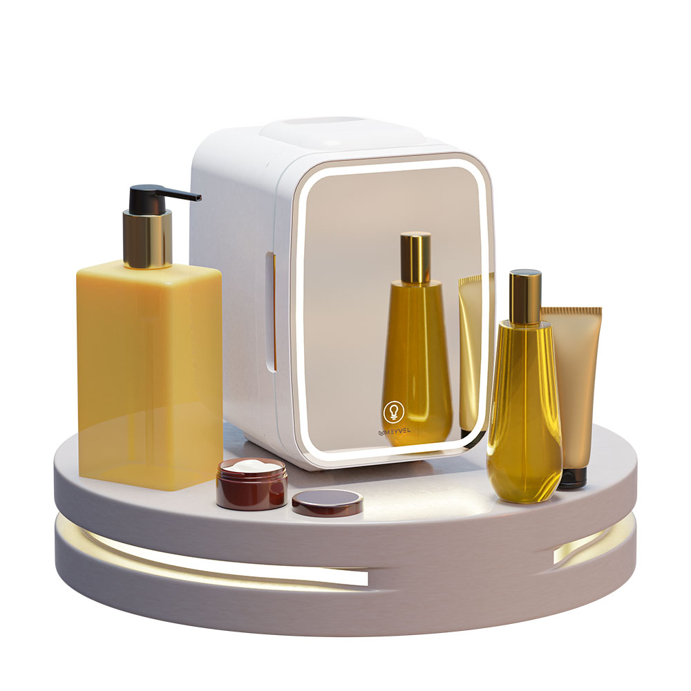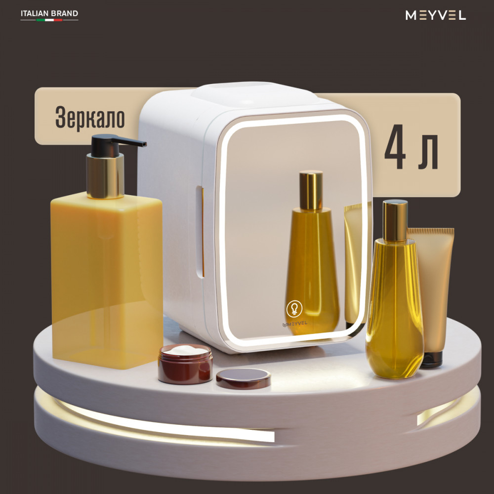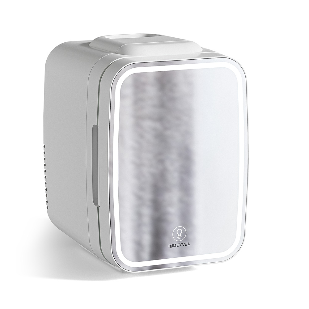 Компактный бьюти холодильник для косметики Meyvel MB-04HC2W, в белом цвете с зеркальным фронтом и освещением по периметру