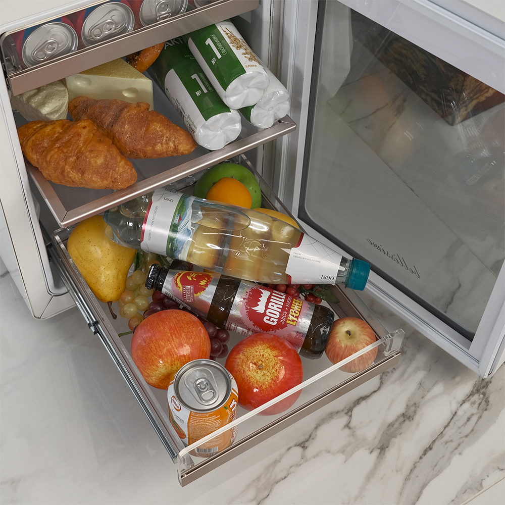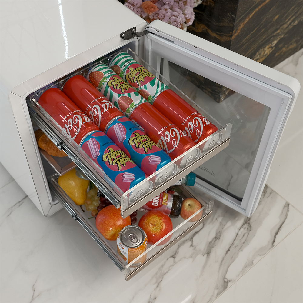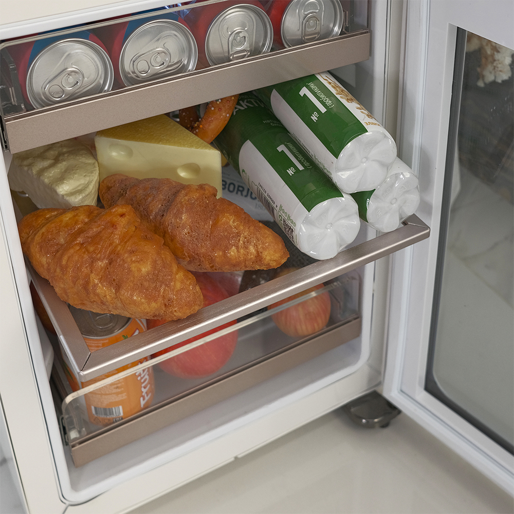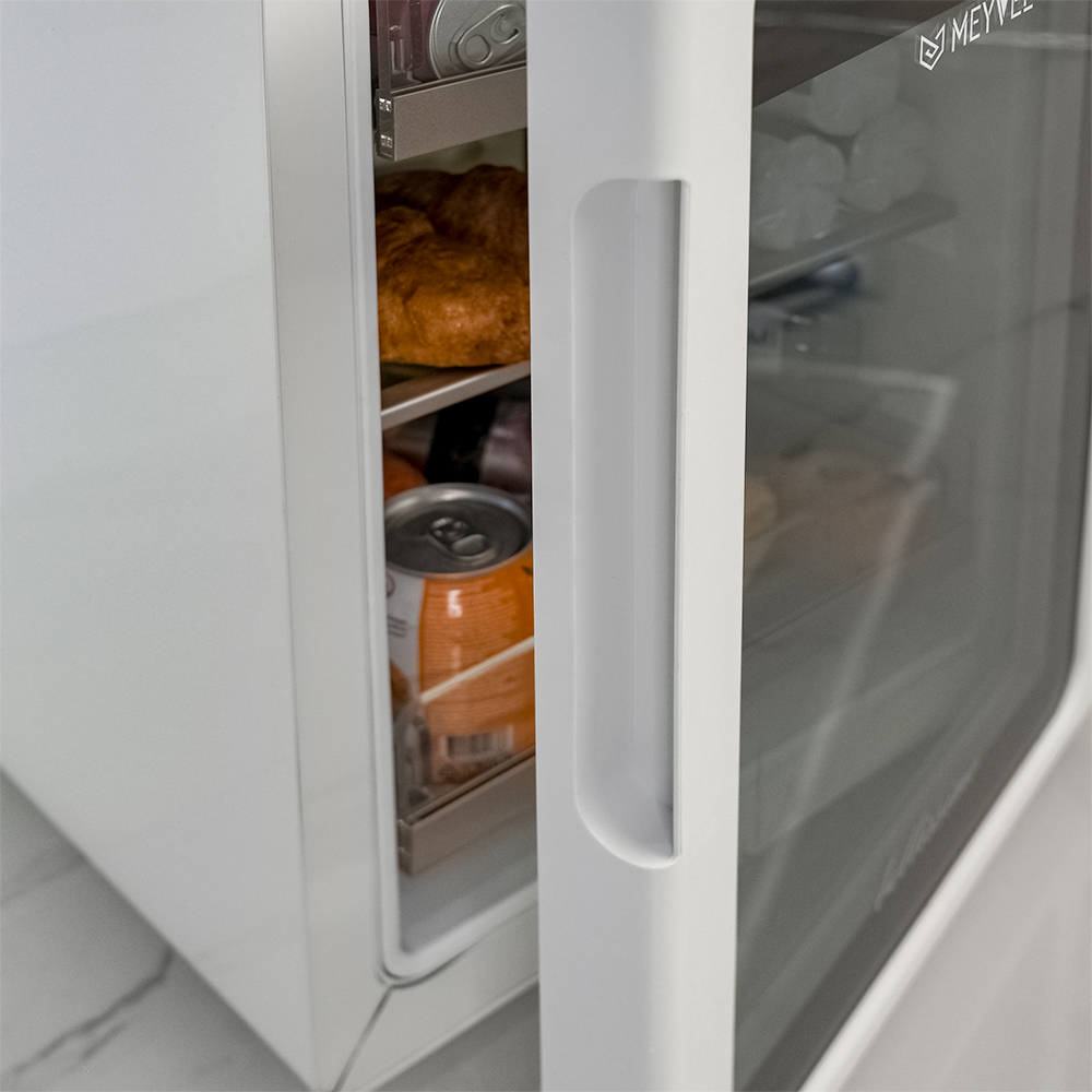 Модель отлично впишется в любой интерьер благодаря современному белому дизайну, стеклянной дверце и панорамной подсветке. Внутри предусмотрено антибактериальное покрытие, которое помогает поддерживать чистоту и защищает содержимое. Компактный формат делает холодильник удобным аже для небольшого пространства, а значит, он подойдёт и для дома, и для салона, где важно красиво хранить и при желании эффектно показывать товар.