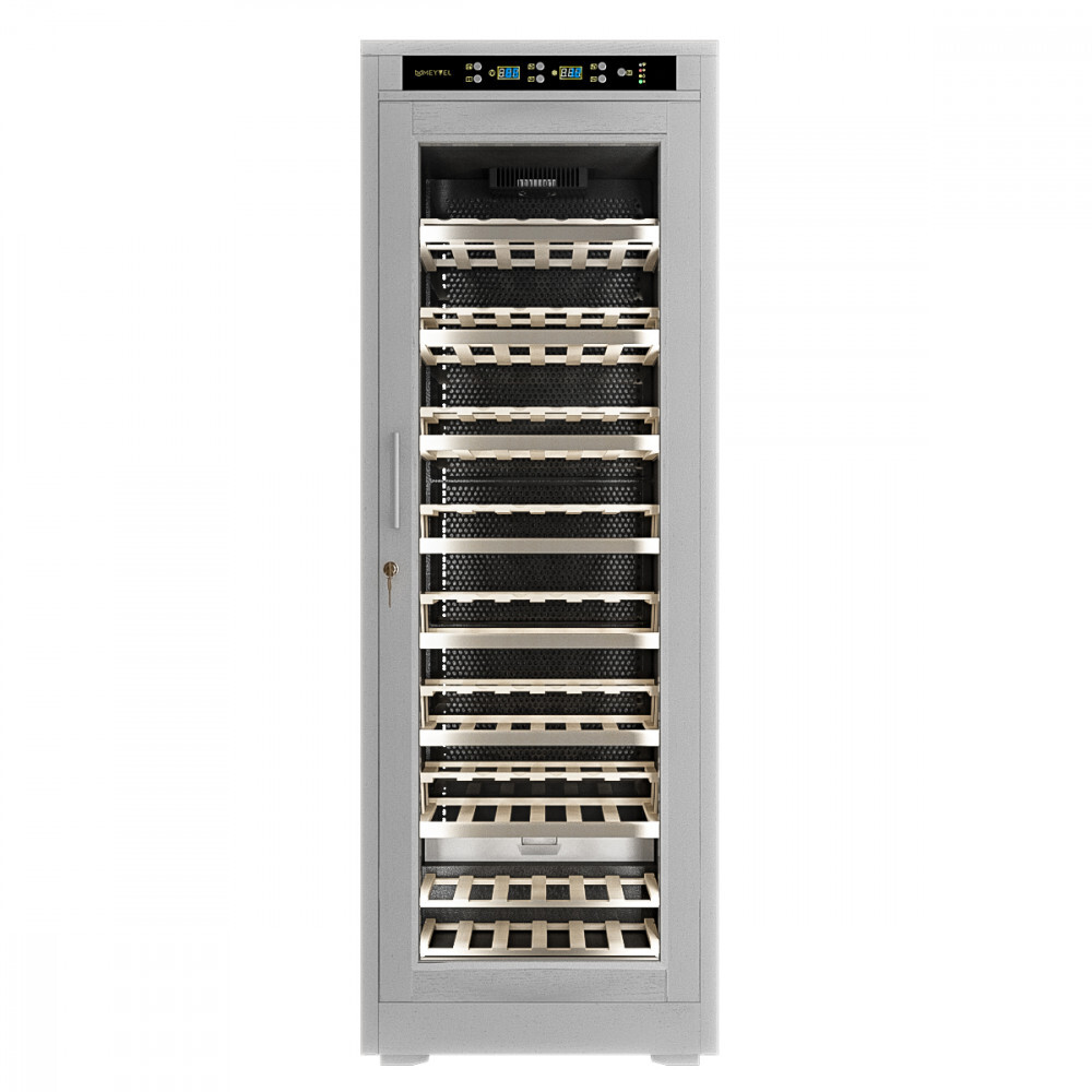Модель оснащена угольным фильтром для предотвращения появления плесени и запахов, а также резервуаром для контроля уровня влажности, особенно важного для сохранности вина. Стекло двери защищает от УФ-излучения, а LED-подсветка позволяет эффектно демонстрировать коллекцию. Внутри расположены 13 полок для бутылок с возможностью настройки температуры и влажности через интуитивно понятное управление. Автоматическое размораживание и антизапотевание двери делают использование шкафа комфортным и простым.