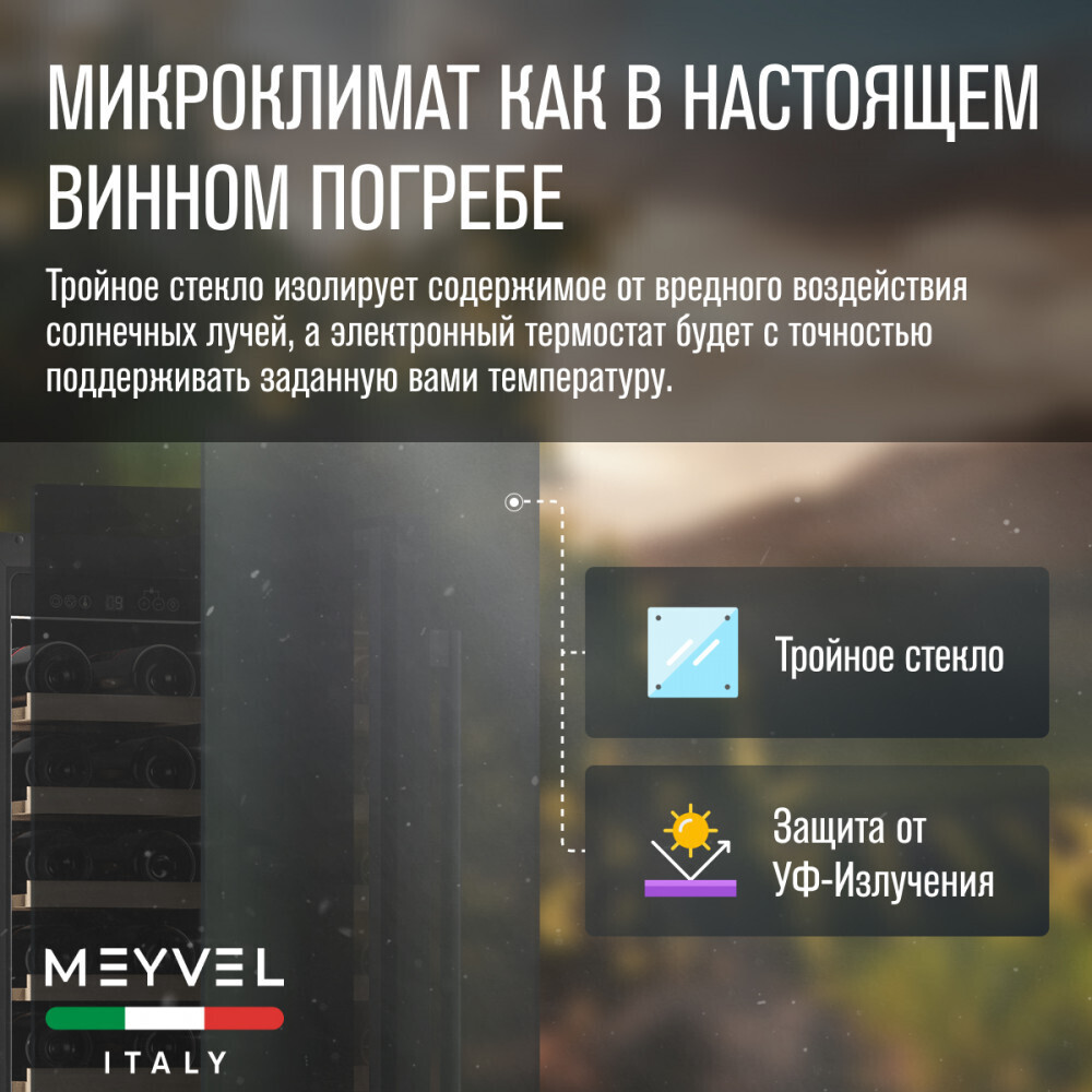 MV9-KBT1 поддерживает оптимальную температуру и влажность воздуха. Двойное стекло изолирует содержимое от вредного воздействия солнечных лучей. Два электронных термостата будут с точностью поддерживать заданную Вами температуру.
