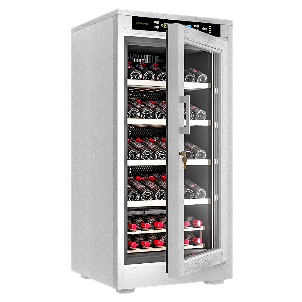 Внутреннее пространство, объемом 200 литров, эффективно охлаждается благодаря алюминиевому покрытию, обеспечивающему равномерную циркуляцию воздуха. Инновационный компрессор Embraco работает практически бесшумно, а специальные резинки исключают вибрации, сохраняя содержание в идеальном состоянии. Шесть полок делают размещение бутылок удобным, включая полки с водными резервуарами для контроля влажности. Двойное стекло защищает от УФ-излучения, а угольный фильтр помогает предотвратить появление плесени и неприятных запахов, обеспечивая оптимальную вентиляцию. Резервуар для воды поможет поддерживать необходимый уровень влажности, особенно в сухие зимние месяцы, что существенно продлевает срок хранения вина.