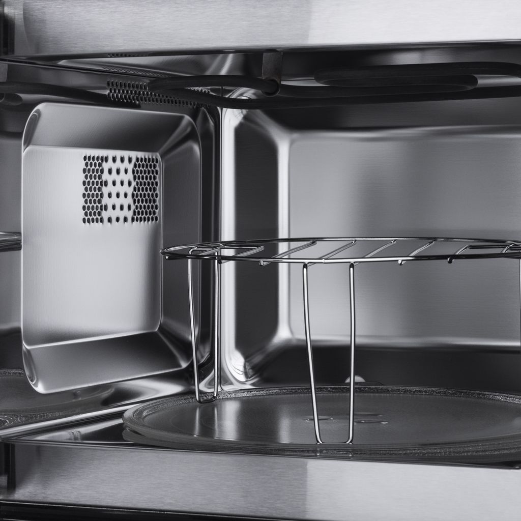 - Внутренняя камера имеет объем в 20 л и сделана из нержавеющей стали толщиной 0,9 мм, обладающей высоким показателем износостойкости. Внутри камеры установлен тэновый гриль, вращающееся кольцо со стеклянным столиком и галогеновое освещение.