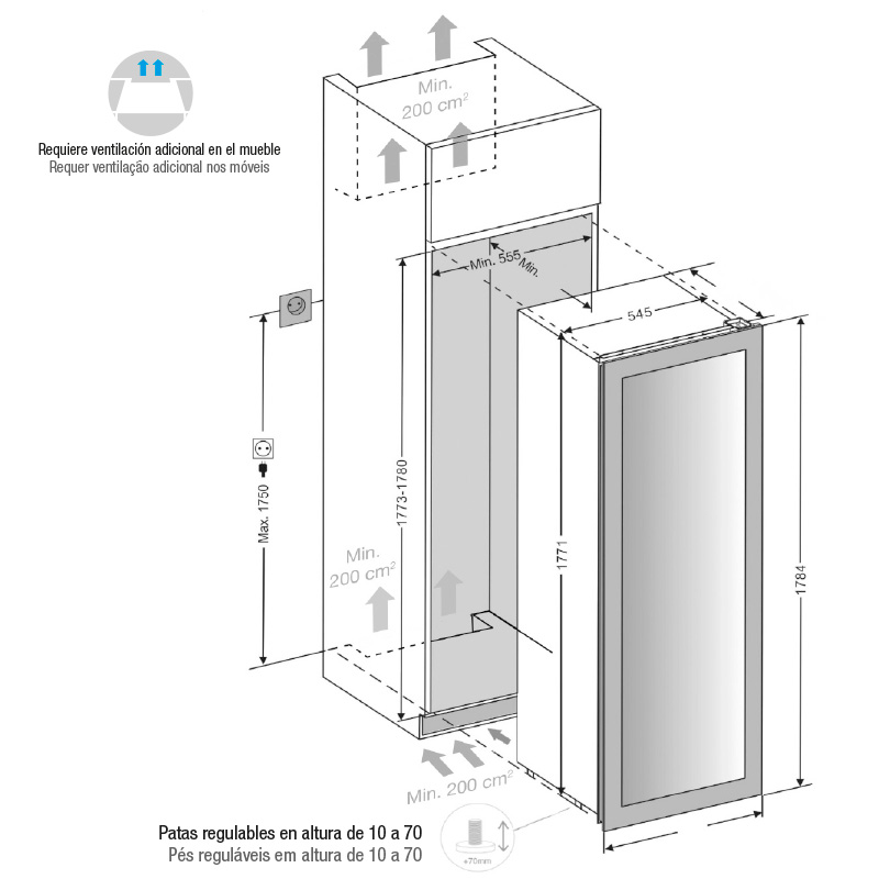 В нижней части винного шкафа имеется вентиляционная решетка, которая позволяет холодному воздуху проникать внутрь, а в верхней части - еще одна вентиляционная решетка, которая выводит теплый воздух наружу. Это означает, что теперь встраиваемые модели могут устанавливаться над рабочими поверхностями в современных кухнях.
