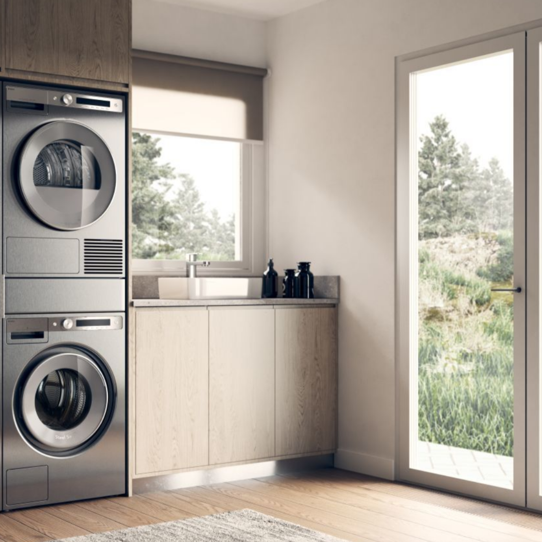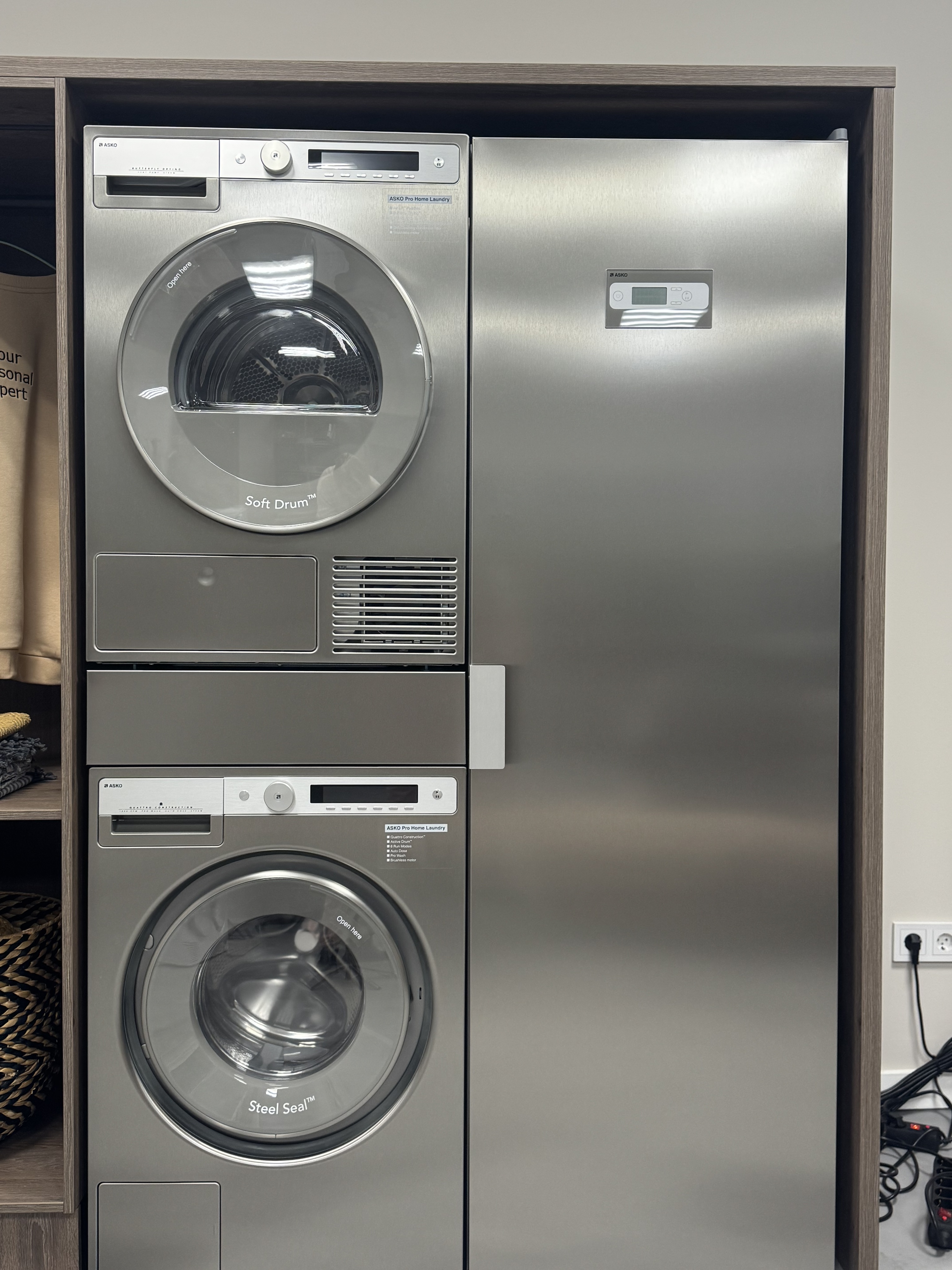 Асko предлагает преимущества двух отдельных устройств: одновременную стирку и сушку, лучшее качество ухода за тканями и большую долговечность по сравнению с приборами 2в1. Комплект подойдет для установки в колонну (высота 185 см), а благодаря системе теплового насоса его можно использовать даже в закрытых помещениях без вентиляции.