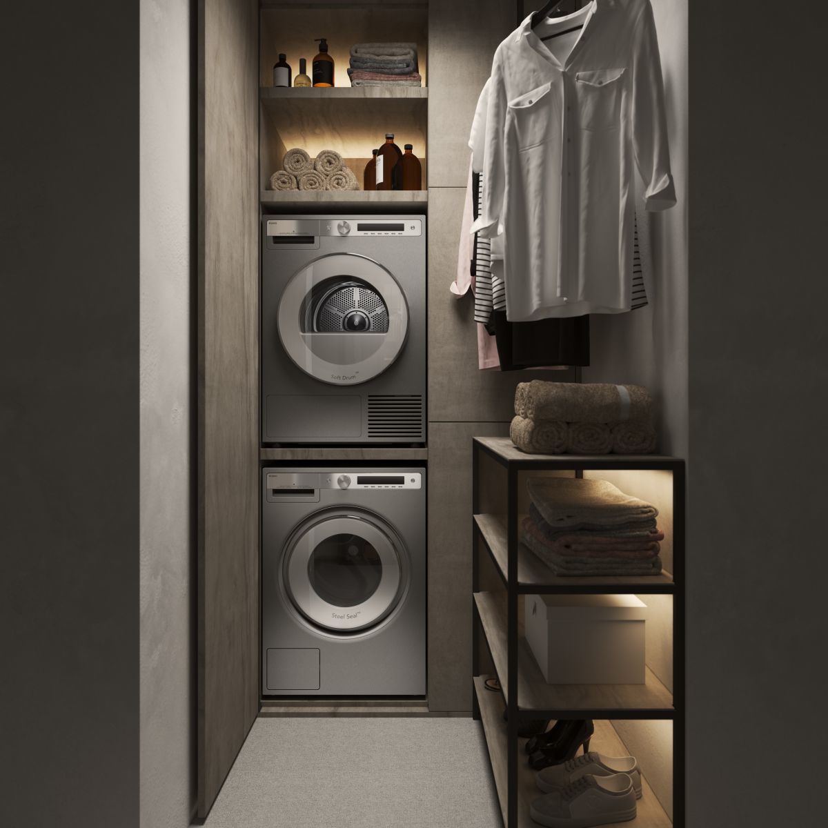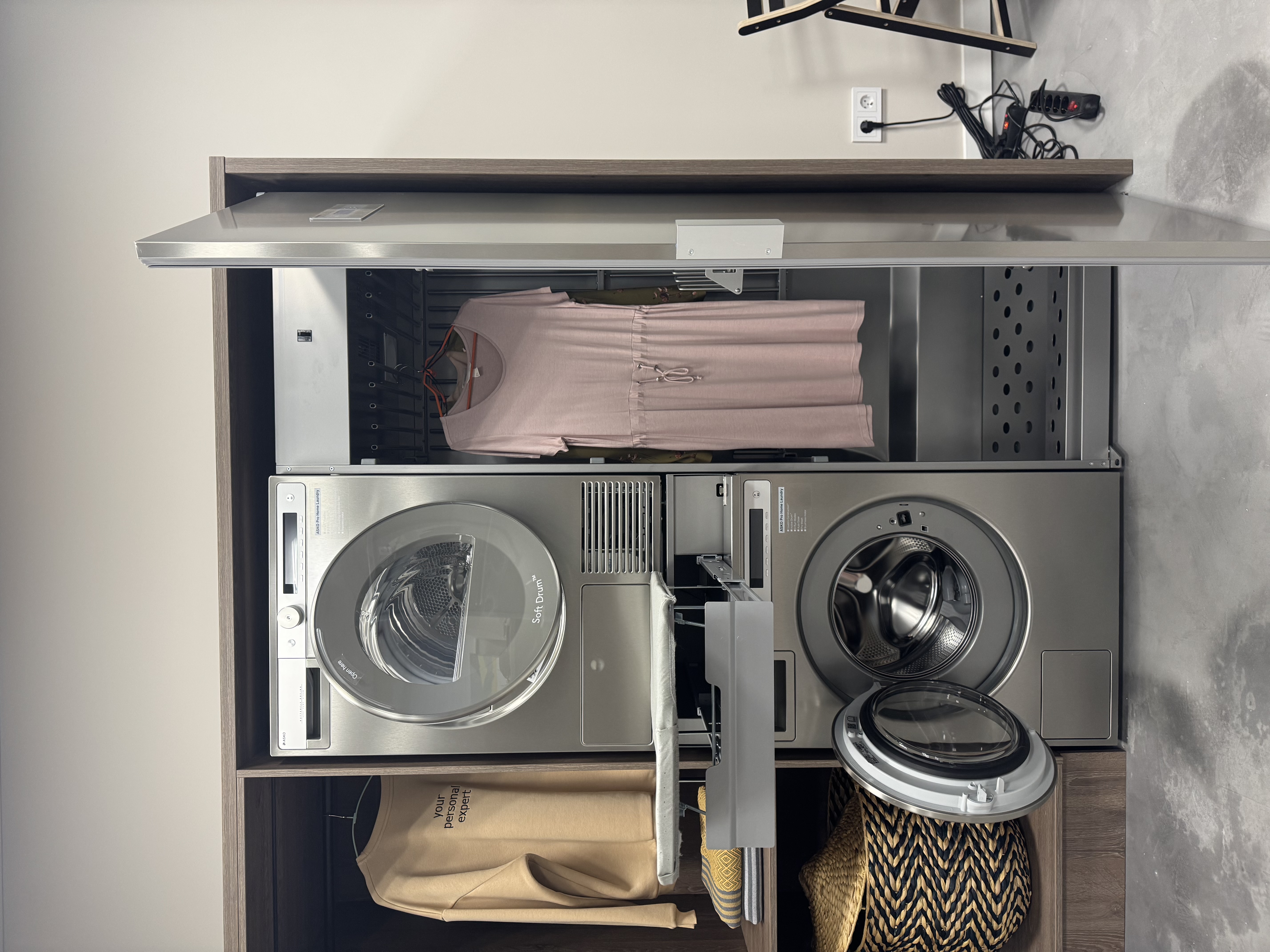 Комплект Asko серии Style для домашней прачечной включает стильную стиральную машину W6098X.S и сушильную машину T608HX.S с тепловым насосом, а также аксессуар с выдвижной полкой и корзиной для белья. Приборы оснащены системой автодозирования моющих средств AutoDosing, профессиональной технологией стирки ProWash и парогенератором, что обеспечивает высокий уровень ухода за тканями, подходит для аллергиков и ценителей удобства.