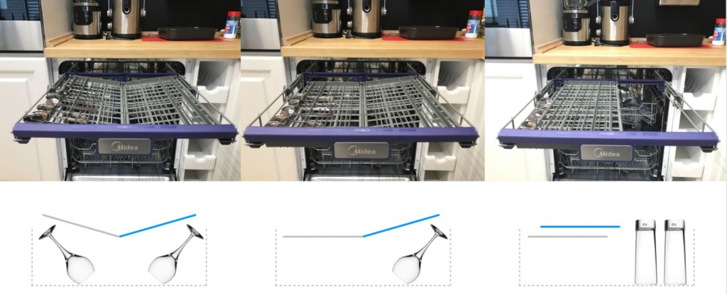 Каждый держатель можно сложить. В совокупности с системой регулировки высоты средней корзины данная особенность позволит отрегулировать геометрию нижней корзины таким образом, чтобы наиболее компактно загрузить посуду нестандартных форм и габаритов.