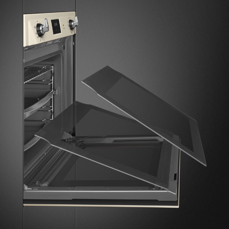 - Холодная дверца: у большинства духовых шкафов Smeg есть «холодная дверь». Благодаря сочетанию тангенциального охлаждения и внутренних теплоотражающих стекол, температура на внешней поверхности дверцы поддерживается ниже 50°C. Эта система не только обеспечивает безопасность, но и защищает боковые поверхности мебели от перегрева духовкой.