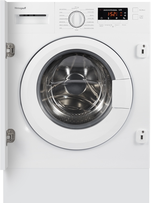 Стиральная машина Weissgauff является полностью встраиваемой, что позволит вам целиком скрыть её, навесив на фронтальную сторону фасад кухни. При этом, петли для крепления уже идут в комплекте вместе с моделью, и их не требуется докупать дополнительно.