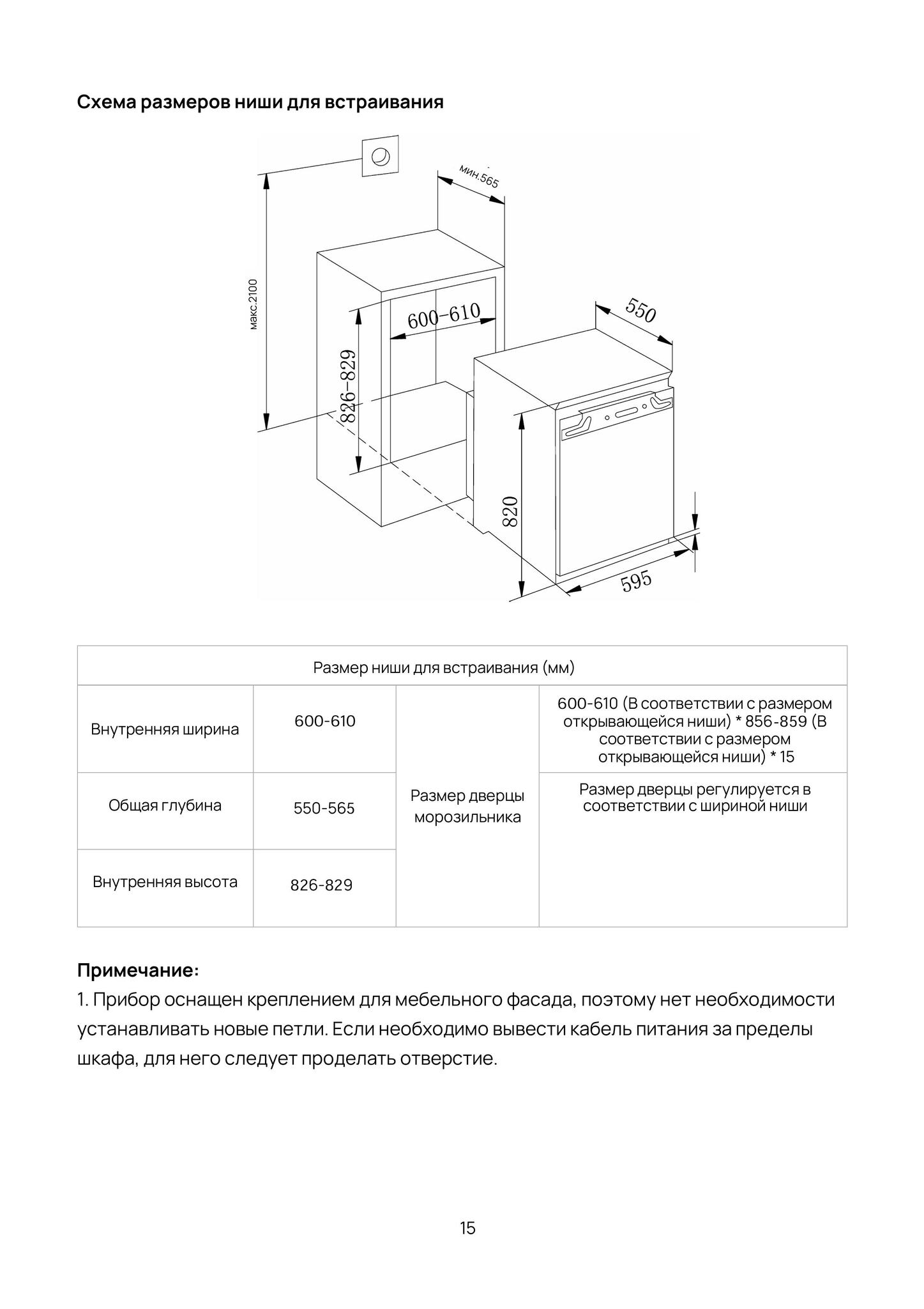 После транспортировки, перед подключением, следует оставить прибор в вертикальном положении в течение 2 часов. Установка прибора следует производить в вентилируемые ниши, с учетом указанных расстояний до ближайших поверхностей. Фасад может навешиваться путем жесткого крепления непосредственно на дверцу прибора или при помощи направляющих. Тип навешивания фасада необходимо уточнить перед приобретением. Дверь холодильника может перенавешиваться и открываться в правую или левую сторону. Рекомендуется устанавливать холодильник / морозильник на удалении от нагревающихся приборов, чтобы сократить частоту включения компрессора и продлить срок службы прибора.
